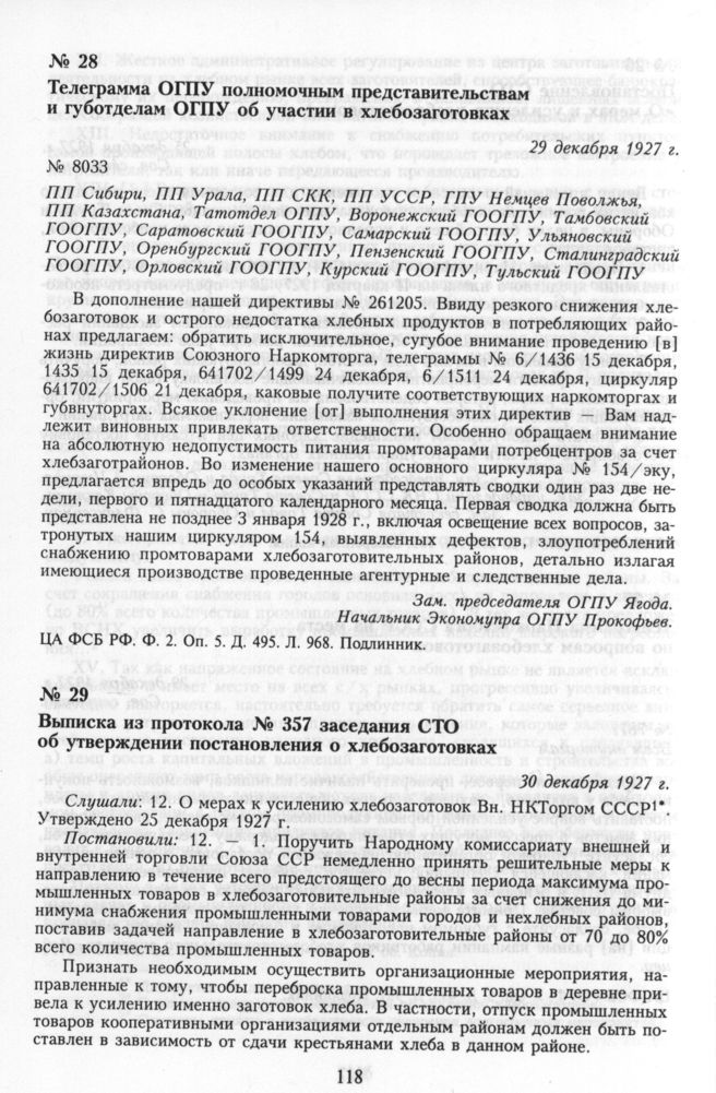 Выписка из протокола № 357 заседания СТО об утверждении постановления о хлебозаготовках. 30 декабря 1927 г. // ГА РФ. Ф. 374. Оп. 28. Д. 2540. Л. 28-29. Копия.