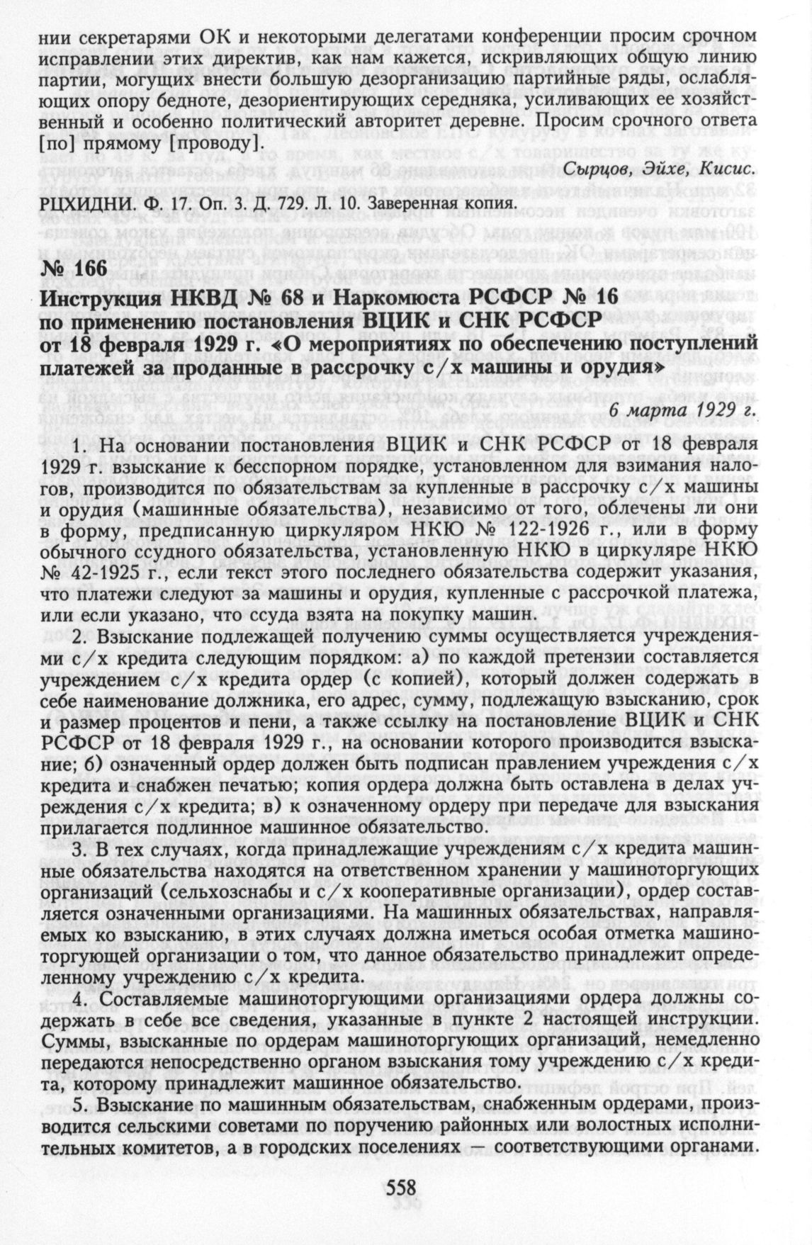 Инструкция НКВД № 68 и Наркомюста РСФСР № 16 по применению постановления ВЦИК и СНК РСФСР от 18 февраля 1929 г. «О мероприятиях по обеспечению поступлений платежей за проданные в рассрочку с/х машины и орудия». 6 марта 1929 г.