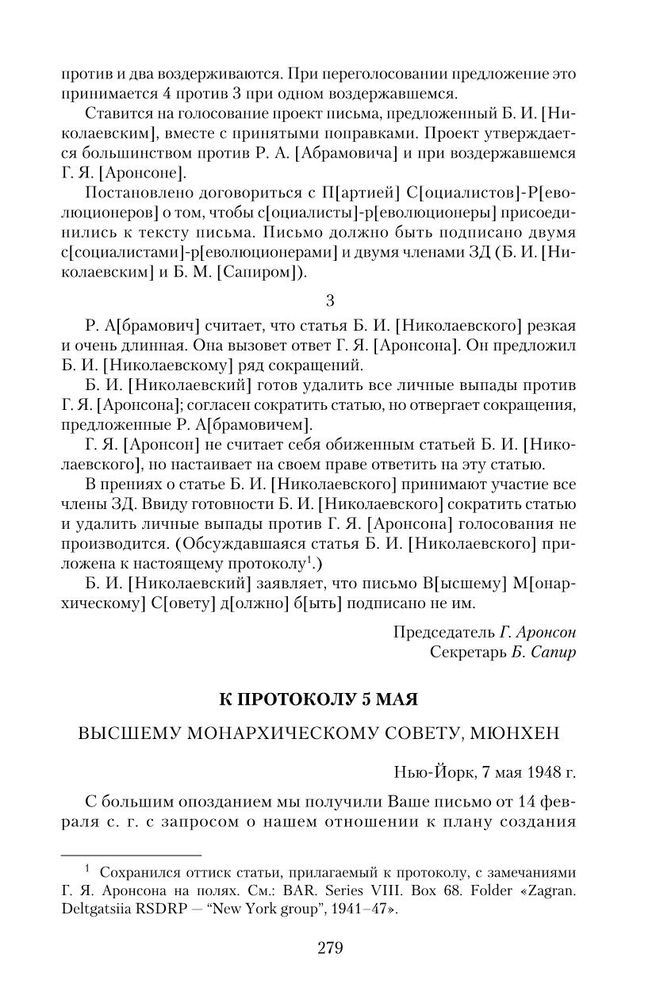 Протокол Заграничной Делегации РСДРП. 1948 г. К протоколу от 5 мая. Высшему монархическому совету, Мюнхен. Нью-Йорк, 7 мая 1948 г. // BAR. Boris Sapir Collection. Series VIII. Box 67. Folder «Protokoly ZD RSDRP — notebook of minutes. 1948–1951». Машинописная копия.