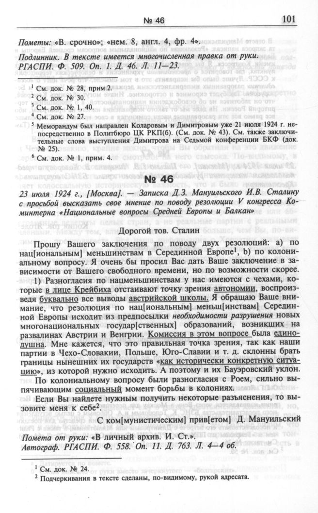 23 июля 1924 г., [Москва]. — Записка Д. З. Мануильского И. В. Сталину с просьбой высказать свое мнение по поводу резолюции V конгресса Коминтерна «Национальные вопросы Средней Европы и Балкан» // Автограф. РГАСПИ. Ф. 558. Оп. 11. Д. 763. Л. 4-4 об.