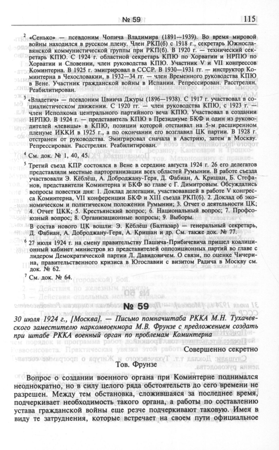 30 июля 1924 г., [Москва]. — Письмо помначштаба РККА М. Н. Тухачевского заместителю наркомвоенмора М. В. Фрунзе с предложением создать при штабе РККА военный орган по проблемам Коминтерна // Копия. РГВА. Ф. 7. Оп. 1. Д. 175. Л. 57.