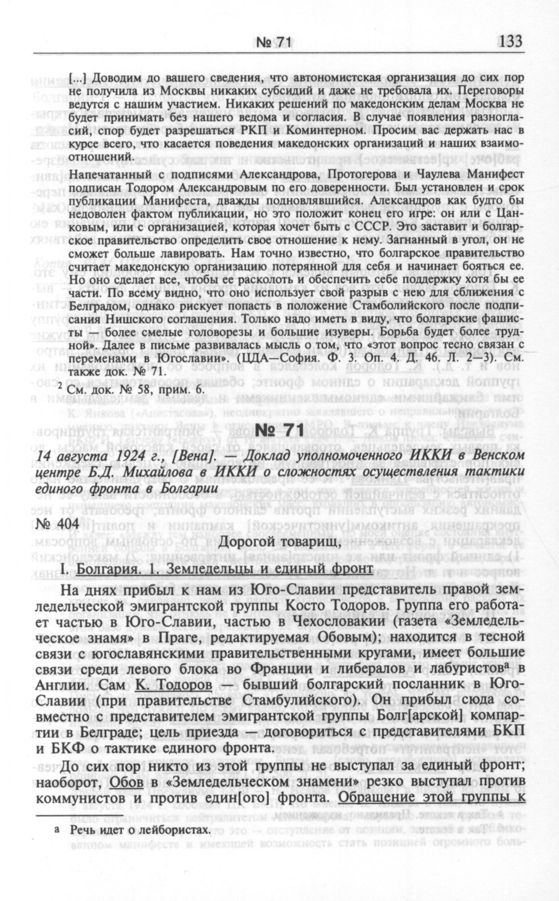14 августа 1924 г., [Вена]. — Доклад уполномоченного ИККИ в Венском центре Б. Д. Михайлова в ИККИ о сложностях осуществления тактики единого фронта в Болгарии // Копия. РГАСПИ. Ф. 498. Оп. 1. Д. 506. Л. 5-6.