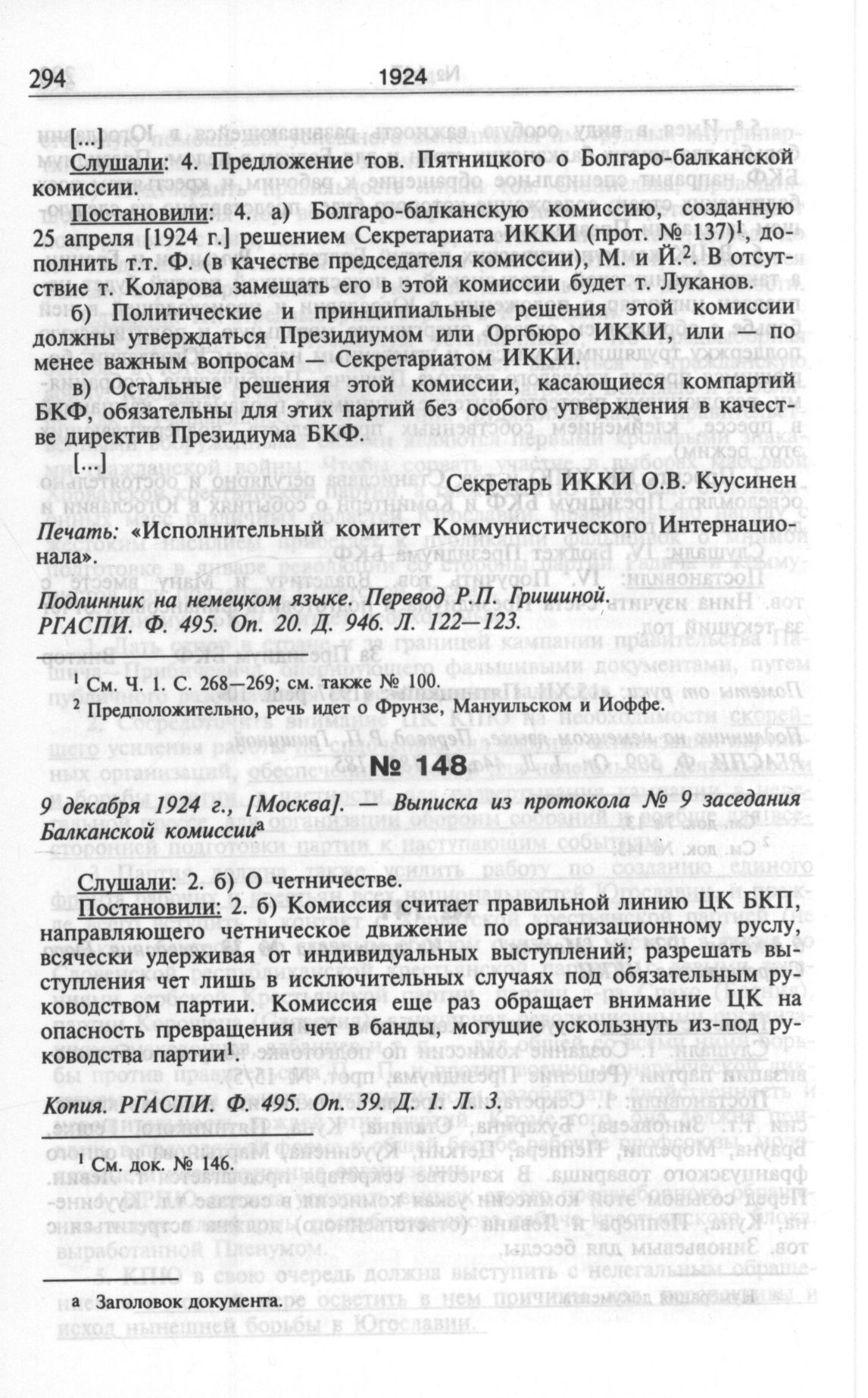 9 декабря 1924 г., [Москва]. — Выписка из протокола № 9 заседания Балканской комиссии // Копия. РГАСПИ. Ф. 495. Оп. 39. Д. 1. Л. 3.