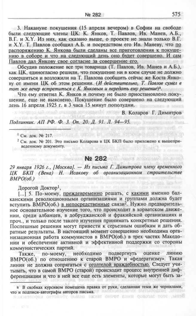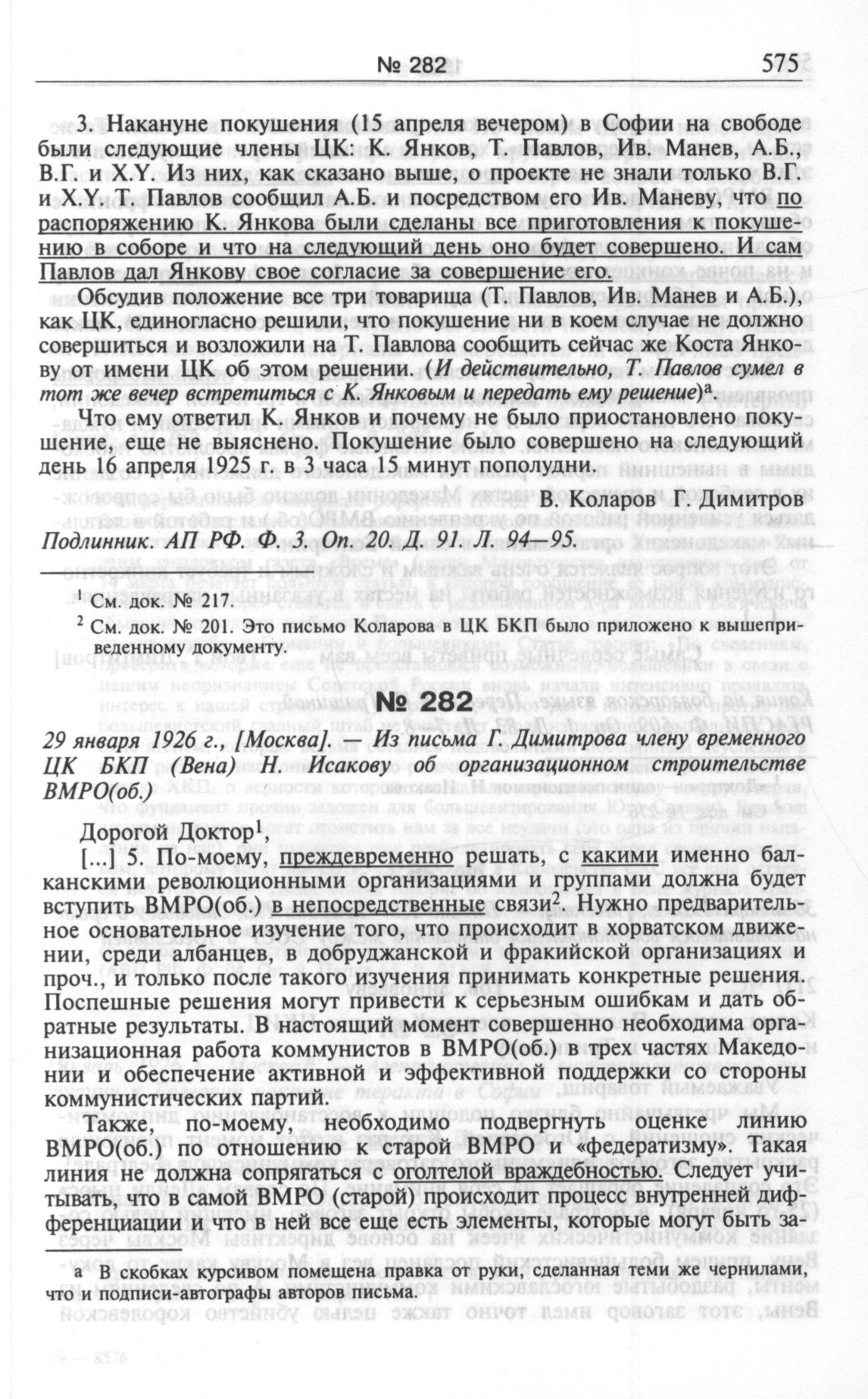 29 января 1926 г., [Москва]. — Из письма Г. Димитрова члену временного ЦК БКП (Вена) Н. Исакову об организационном строительстве ВМРО(об.) // Копия на болгарской языке. РГАСПИ. Ф. 509. Оп. 1. Д. 83. Л. 7-8.