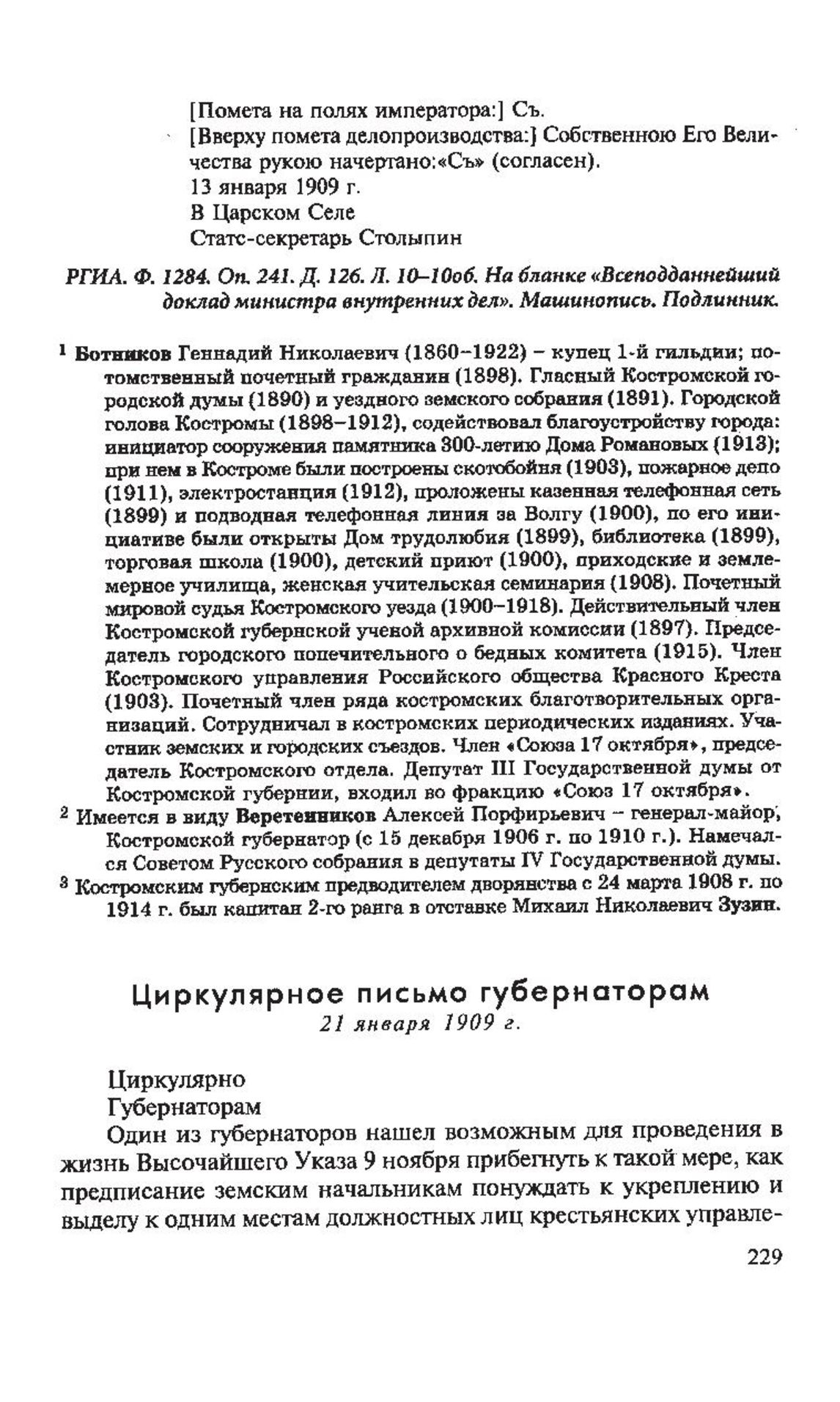 Циркулярное письмо губернаторам. 21 января 1909 г. // РГИА. Ф. 1282. Оп. 3. Д. 109. Л. 8. На бланке «Министерство внутренних дел. Земский отдел». Типографский оттиск.