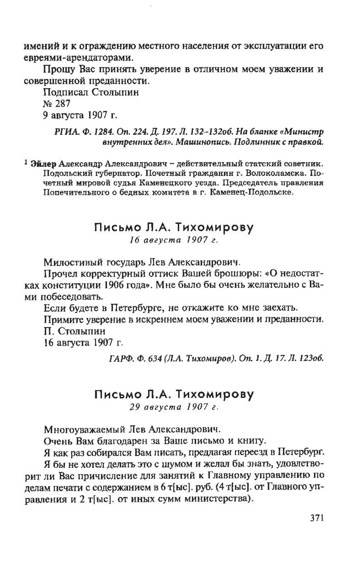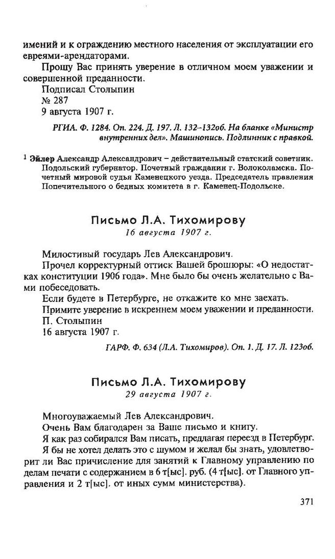 Переписка П. А. Столыпина с политическими и общественными деятелями. Письмо Л.А. Тихомирову. 29 августа 1907 г.