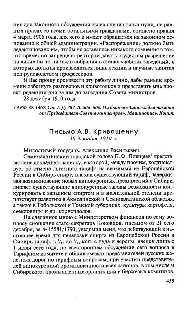 Переписка П. А. Столыпина с политическими и общественными деятелями. Письмо А.В. Кривошеину. 30 декабря 1910 г. // РГИА. Ф. 1276. Оп. 6. Д. 703, Д, 88-88. об. На бланке «Председатель Совета министров». Машинопись. Проект.