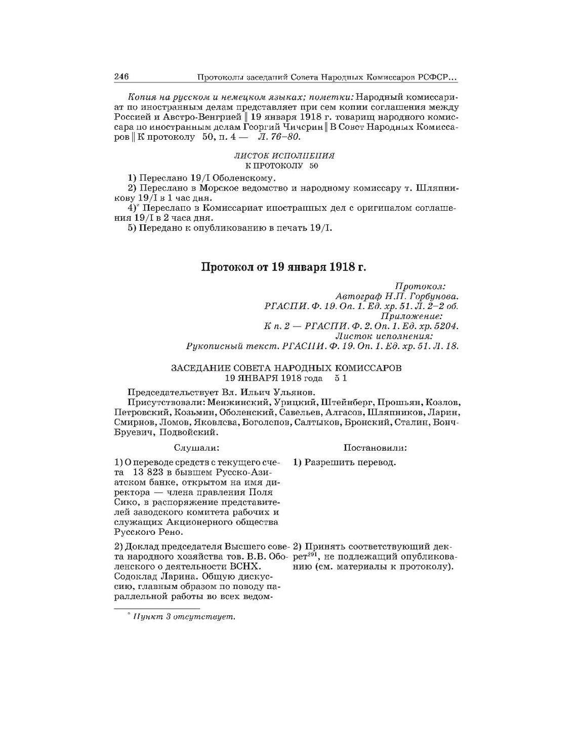 Протокол заседания Совета Народных Комиссаров РСФСР от 19 января 1918 г. // Протокол: Автограф Н.П. Горбунова. РГАСПИ. Ф. 19. Оп. 1. Ед. хр. 51. Л. 2-2 об. Приложение: К п. 2 — РГАСПИ. Ф. 2. Оп. 1. Ед. хр. 5204. Листок исполнения: Рукописный текст. РГАСПИ. Ф. 19. Оп. 1. Ед. хр. 51. Л. 18.