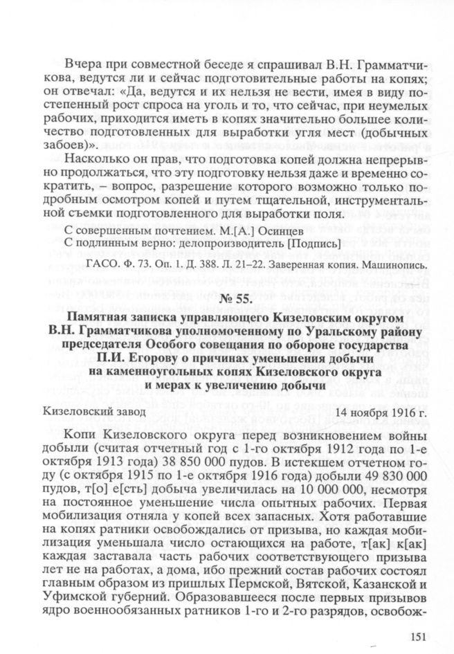 Памятная записка управляющего Кизеловским горным округом В.Н. Грамматчикова уполномоченному по Уральскому району председателя Особого совещания по обороне государства П.И. Егорову о причинах уменьшения добычи на каменноугольных копях Кизеловского округа и мерах к увеличению добычи. 14 ноября 1916 г. // ГАСО. Ф. 73. Oп. 1. Д. 388. Л. 33-34. Подлинник. Машинопись.