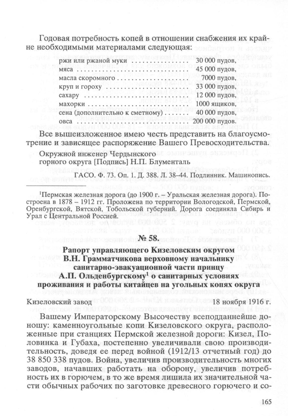 Рапорт управляющего Кизеловским округом В.Н. Грамматчикова верховному начальнику санитарно-эвакуационной части принцу А.П. Ольденбургскому о санитарных условиях проживания и работы китайцев на угольных копях округа. 18 ноября 1916 г. // ГАСО. Ф. 73. Oп. 1. Д. 388. Л. 46-50 об. Копия. Машинопись.