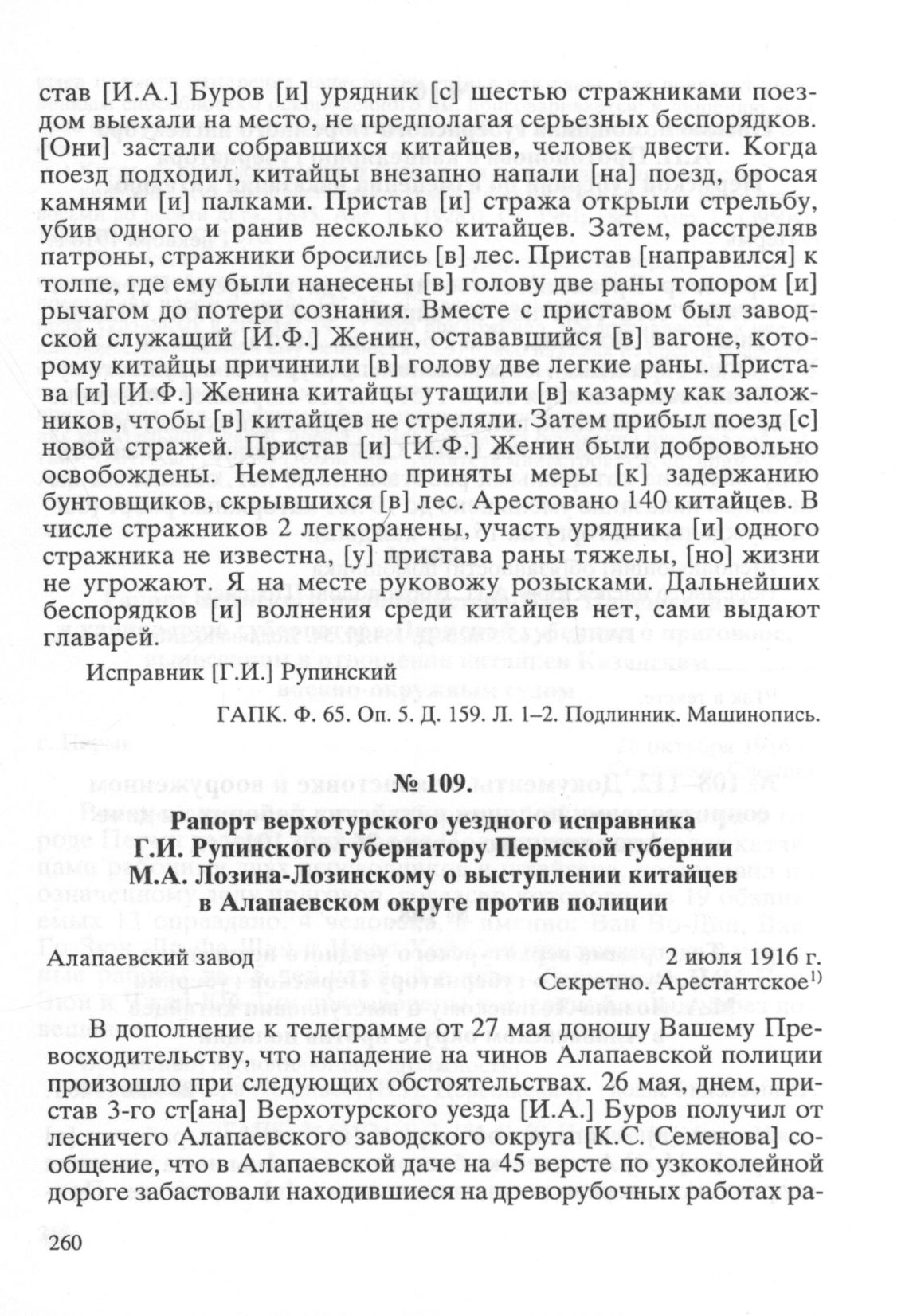 Рапорт верхотурского уездного исправника Г.И. Рупинского губернатору Пермской губернии М.А. Лозина-Лозинскому о выступлении китайцев в Алапаевском округе против полиции. 2 июля 1916 г. // ГАПК. Ф. 65. Оп. 5. Д. 159. Л. 8-11 об. Подлинник. Машинопись.