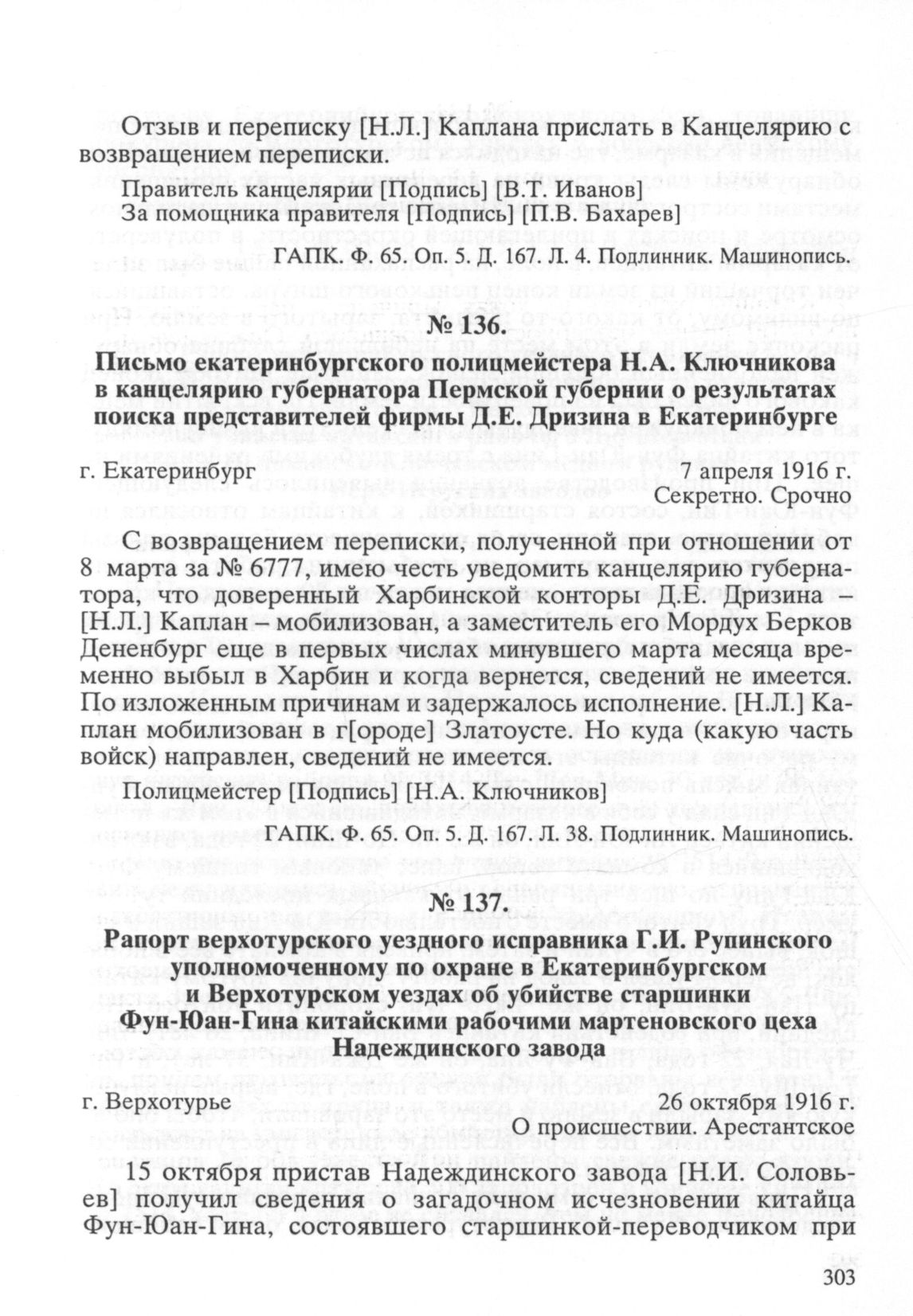 Письмо екатеринбургского полицмейстера Н.А. Ключникова в канцелярию губернатора Пермской губернии о результатах поиска представителей фирмы Д.Е. Дризина в Екатеринбурге. 7 апреля 1916 г. // ГАПК. Ф. 65. Оп. 5. Д. 167. Л. 38. Подлинник. Машинопись.