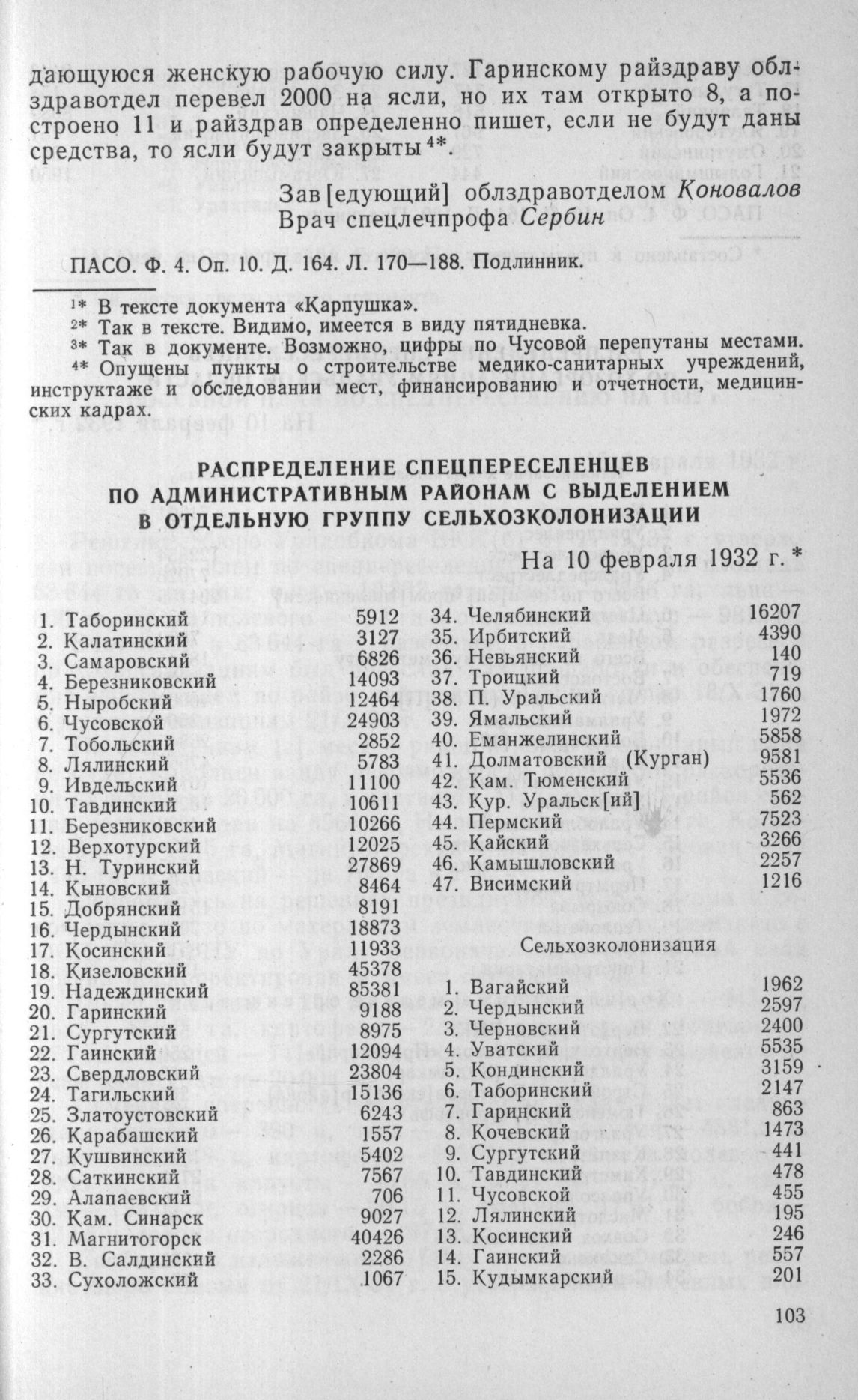 Распределение спецпереселенцев по административным районам (с выделением в отдельную группу сельхозколонизации). На 10 февраля 1932 г. // ПАСО. Ф. 4. Oп. 10. Д. 164. Л. 189. Подлинник.
