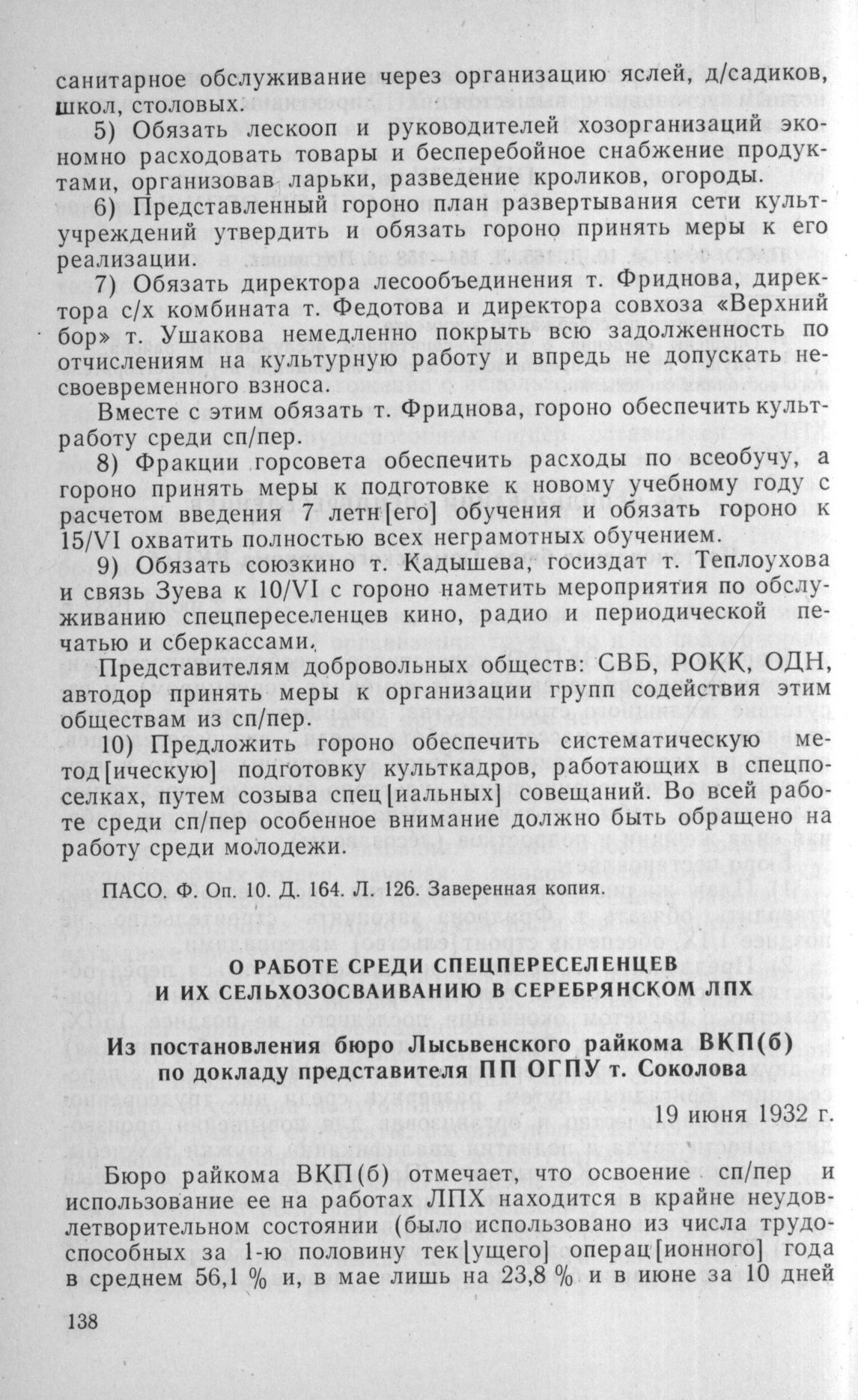 О работе среди спецпереселенцев и их сельхозосваиванию в Серебрянском ЛПХ. Из постановления бюро Лысьвенского райкома ВКП(б) по докладу представителя ПП ОГПУ т. Соколова. 19 июня 1932 г. // ПАСО. Ф. 4. Оп. 10. Д. 164. Л. 128—129. Копия.