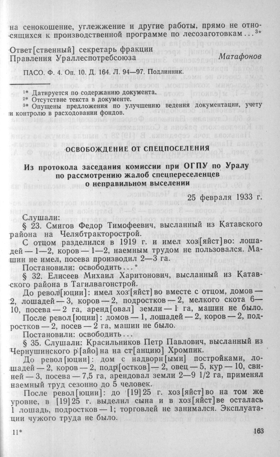 Освобождение от спецпоселения. Из протокола заседания комиссии при ОГПУ по Уралу по рассмотрению жалоб спецпереселенцев о неправильном выселении. 25 февраля 1933 г. // ГАСО. Ф. Р-88. Оп. 1-а. Д. 96. Л. 5, 7, 9, 11, 13, 15, 22. Заверенная копия.