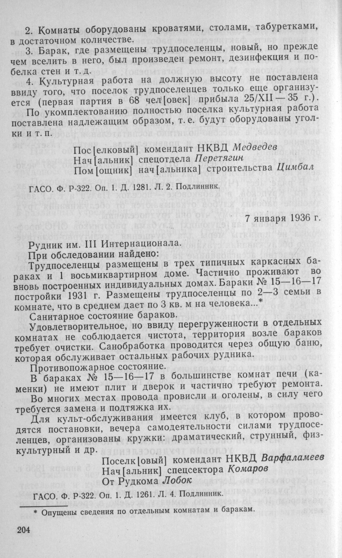 Из актов обследования культурно-бытовых условий трудпоселенцев. Рудник им. III Интернационала. 7 января 1936 г. // ГАСО. Ф. P-322. Oп. 1. Д. 1261. Л. 4. Подлинник.