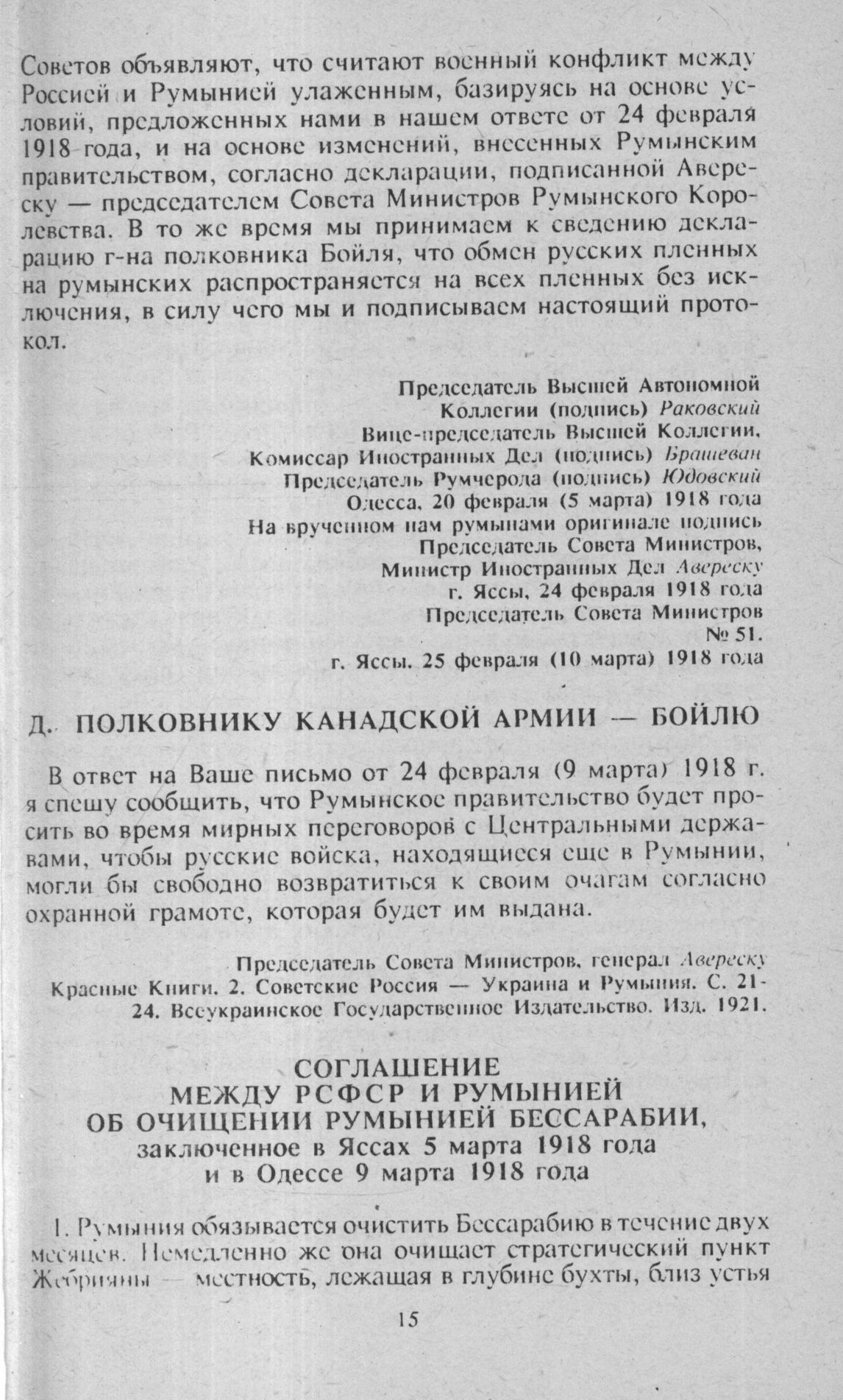 Русско-румынские переговоры об эвакуации Бессарабии румынской армией. Февраль-март 1918 года. Д. Полковнику Канадской армии — Бойлю // Красные Книги. 2. Советские Россия — Украина и Румыния. С. 21-24. Всеукраинское Государственное Издательство. Изд. 1921.