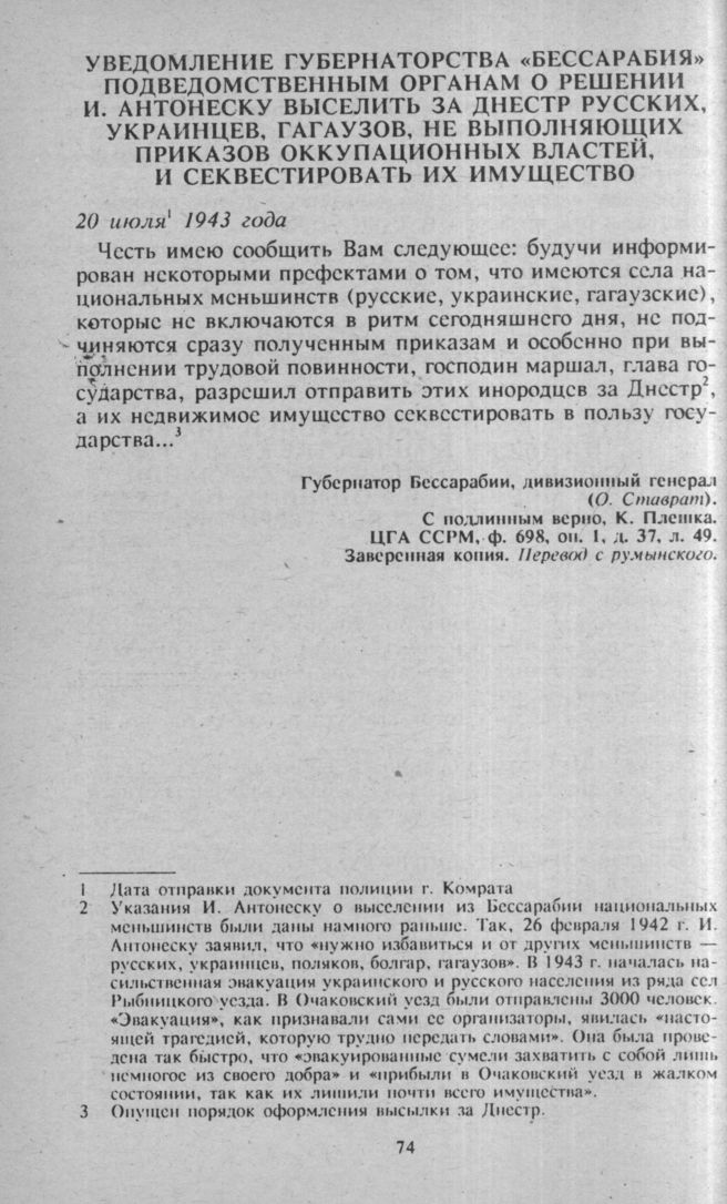 Уведомление губернаторства «Бессарабия» подведомственным органам о решении И. Антонеску выселить за Днестр русских, украинцев, гагаузов, не выполняющих приказов оккупационных властей, и секвестировать их имущество. 20 июля 1943 года // ЦГА ССРМ, ф. 698, оп. 1, д. 37, л. 49. Заверенная копия. Перевод с румынского.