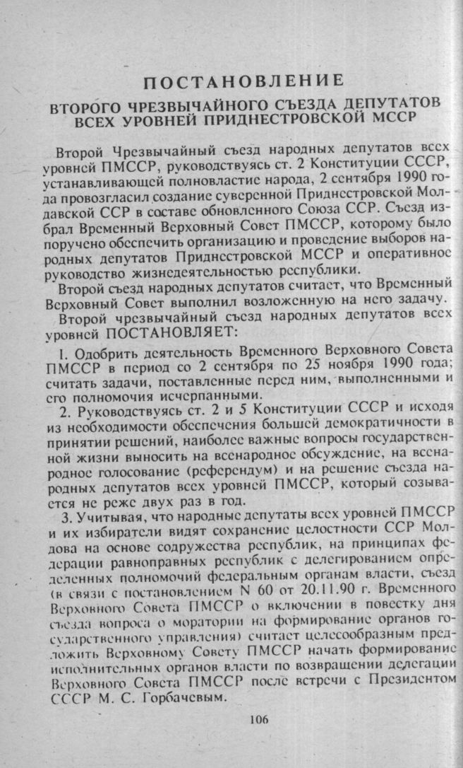Постановление второго Чрезвычайного съезда депутатов всех уровней Приднестровской МССР. 30 ноября 1990 года