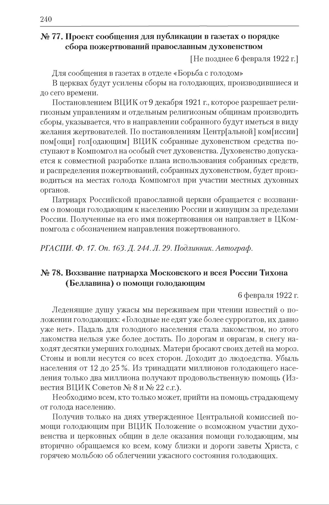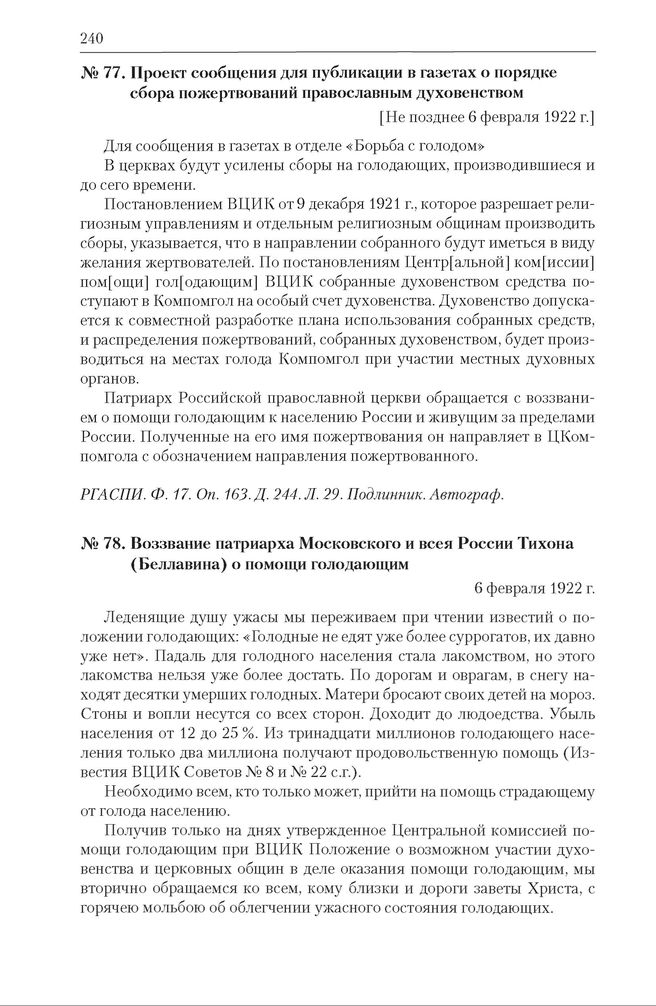 Материалы к заседанию Политбюро от 9 февраля 1922 г. по вопросу публикации воззвания патриарха Московского и всея России Тихона (Беллавина) о помощи голодающим (06–09.02.1922). Проект сообщения о порядке сбора пожертвований православным духовенством для публикации в газетах [Не позднее 6 февраля 1922 г.] // РГАСПИ. Ф. 17. Оп. 163. Д. 244. Л. 29. Подлинник. Автограф.
