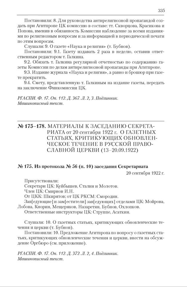 Секретариат ЦК РКП(б). Материалы к заседанию Секретариата от 20 сентября 1922 г. о газетных статьях, критикующих обновленческое течение в Русской православной церкви (13–20.09.1922). Из протокола № 56 (п. 10) заседания Секретариата. 20 сентября 1922 г. // РГАСПИ. Ф. 17. Оп. 112. Д. 372. Л. 2, 4. Подлинник. Машинописный текст.