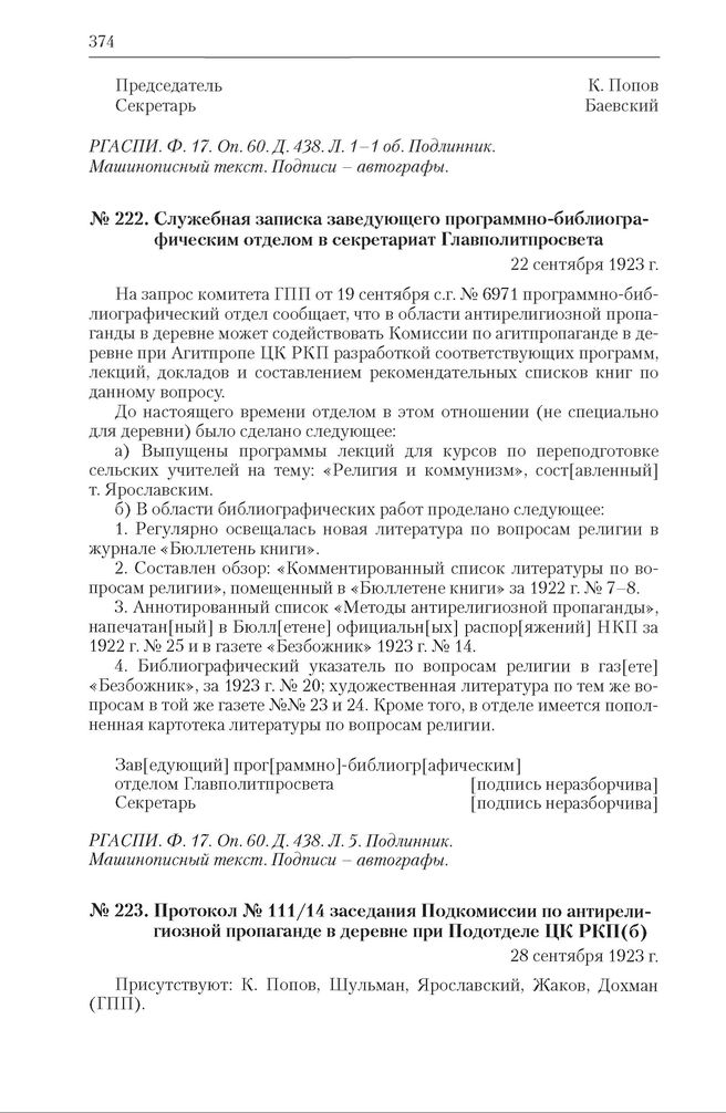 Отдел Агитации и пропаганды ЦК РКП(б) (Комиссия при подотделе пропаганды по антирелигиозной работе) (1921–1923). Из отчетов агитационно-пропагандистского отдела о проведении антирелигиозных мероприятий и религиозной ситуации на местах (1922–1923). Служебная записка заведующего программно-библиографическим отделом в секретариат Главполитпросвета. 22 сентября 1923 г. // РГАСПИ. Ф. 17. Оп. 60. Д. 438. Л. 5. Подлинник. Машинописный текст. Подписи – автографы.