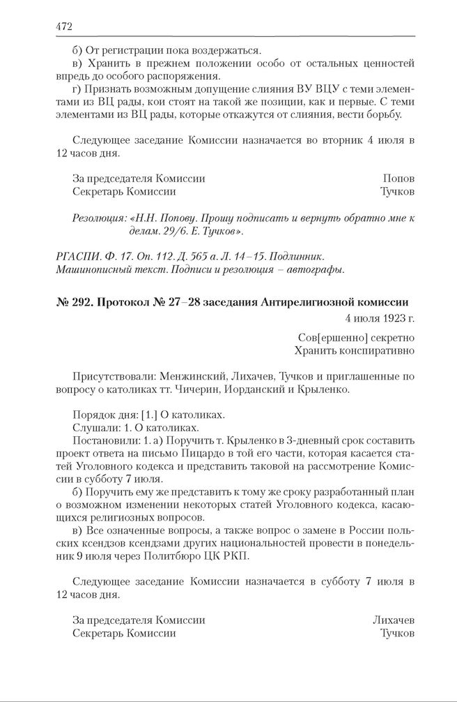 Комиссия по проведению отделения церкви от государства (Антирелигиозная комиссия) (1922–1924). Протокол № 27–28 заседания Антирелигиозной комиссии. 4 июля 1923 г. // РГАСПИ. Ф. 17. Оп. 112. Д. 565 а. Л. 16. Подлинник. Машинописный текст. Подписи и резолюция – автографы.