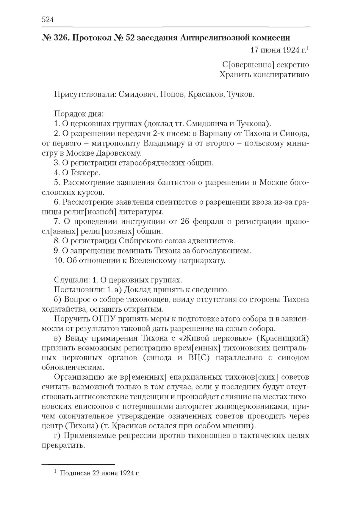 Комиссия по проведению отделения церкви от государства (Антирелигиозная комиссия) (1922–1924). Протокол № 52 заседания Антирелигиозной комиссии. 17 июня 1924 г.