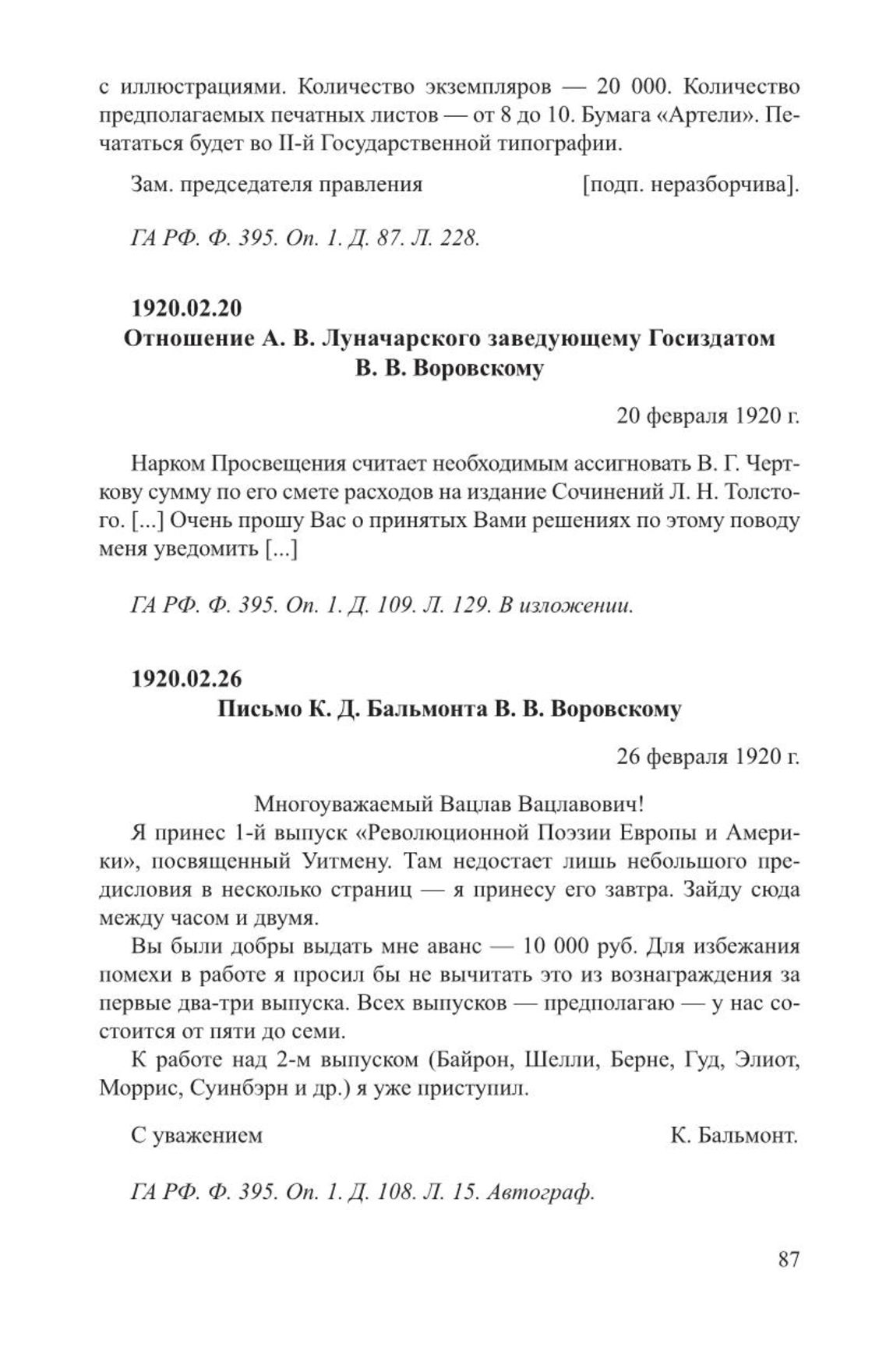 Отношение А. В. Луначарского заведующему Госиздатом В. В. Воровскому. 20 февраля 1920 г. // ГА РФ. Ф. 395. Оп. 1. Д. 109. Л. 129. B изложении.