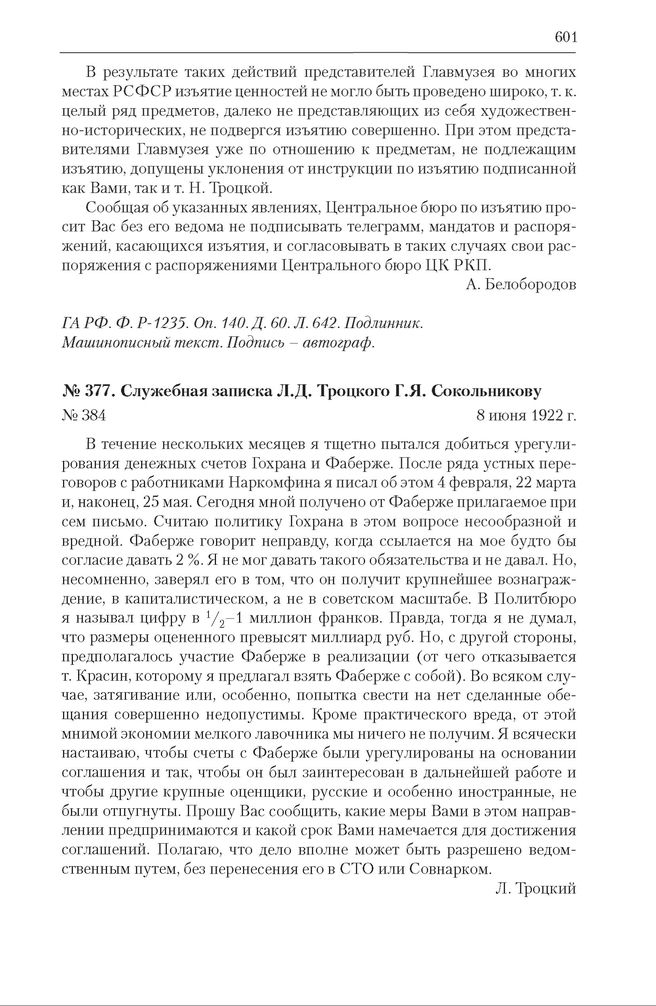 Центральная комиссия по изъятию церковных ценностей (Бюро Центральной комиссии) (1922). Служебная записка Л.Д. Троцкого Г.Я. Сокольникову. 8 июня 1922 г. // ГА РФ. Ф. Р-5446. Оп. 55. Д. 59. Л. 4. Копия. Машинописный текст.