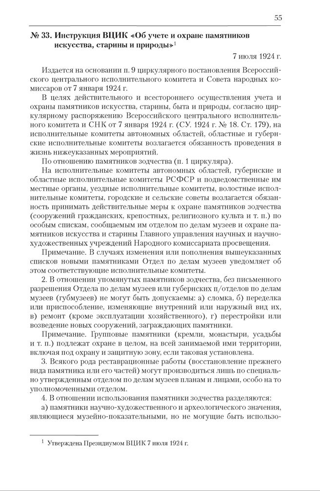 Инструкция ВЦИК «Об учете и охране памятников искусства, старины и природы». 7 июля 1924 г. // СУ. 1923. № 37. Ст. 386.; Гидулянов П.В. Отделение церкви от государства в СССР: Полный сборник декретов, ведомственных распоряжений и определений Верховного суда РСФСР и других социалистических республик. М., 1926. С. 253–255.