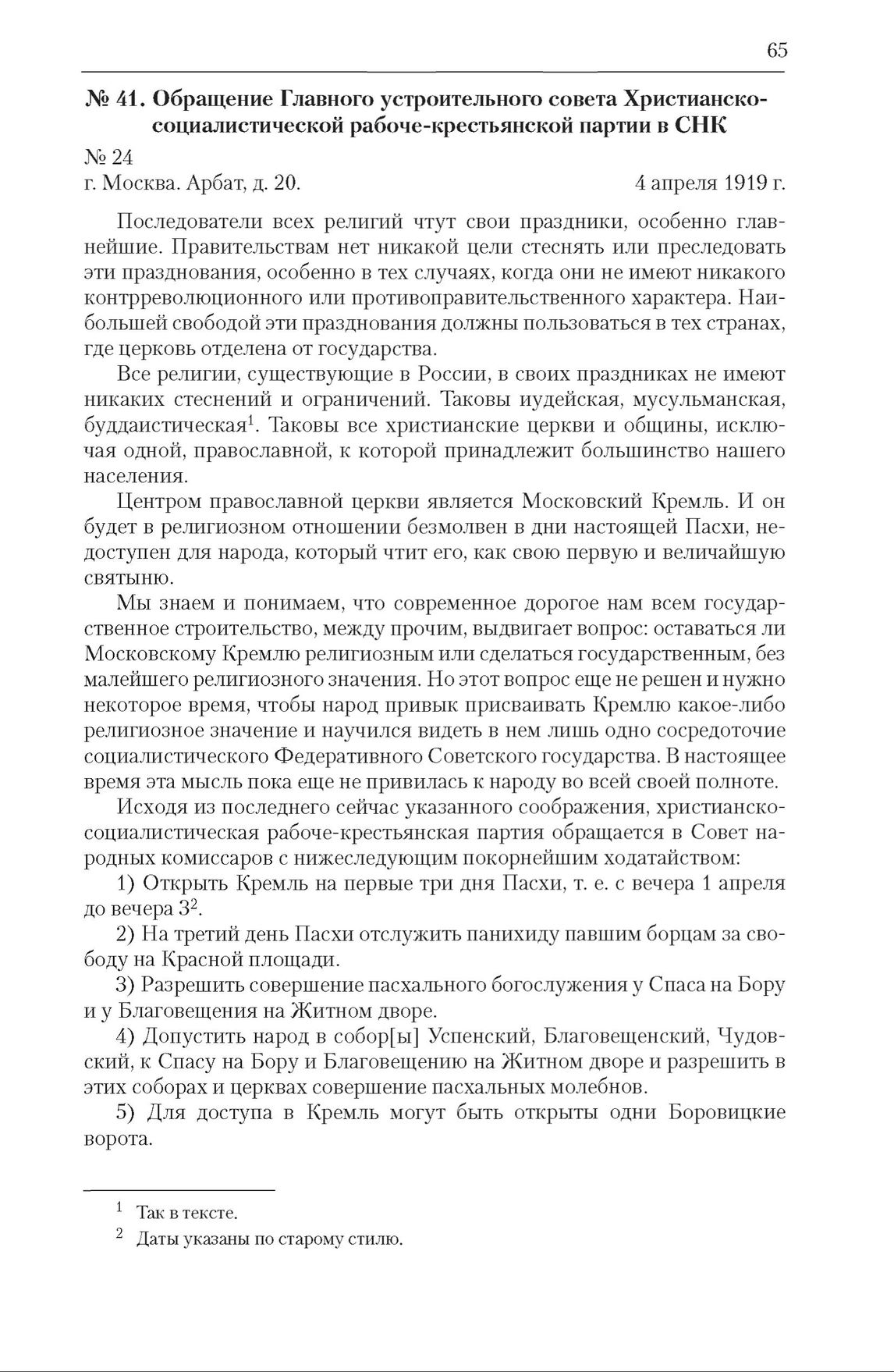 Выписка из протокола заседания Президиума ВЦИК от 11 апреля 1918 г. по вопросу рассмотрения обращения Христианско-социалистической рабоче-крестьянской партии об открытии Московского Кремля в дни пасхальных праздников (04–11.04.1919). Обращение Главного устроительного совета Христианско-социалистической рабоче-крестьянской партии в СНК. 4 апреля 1919 г.