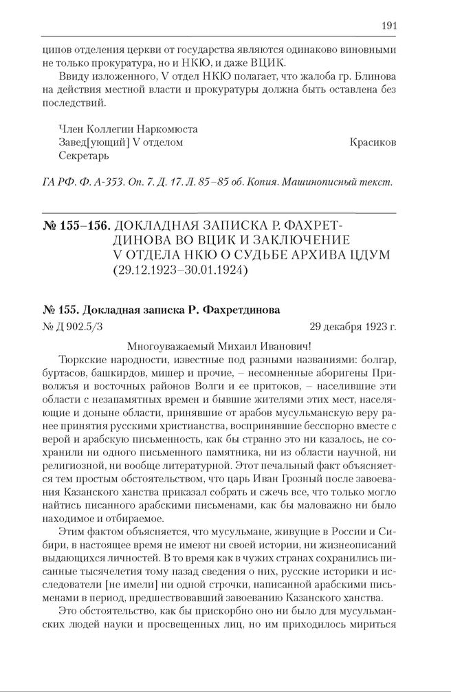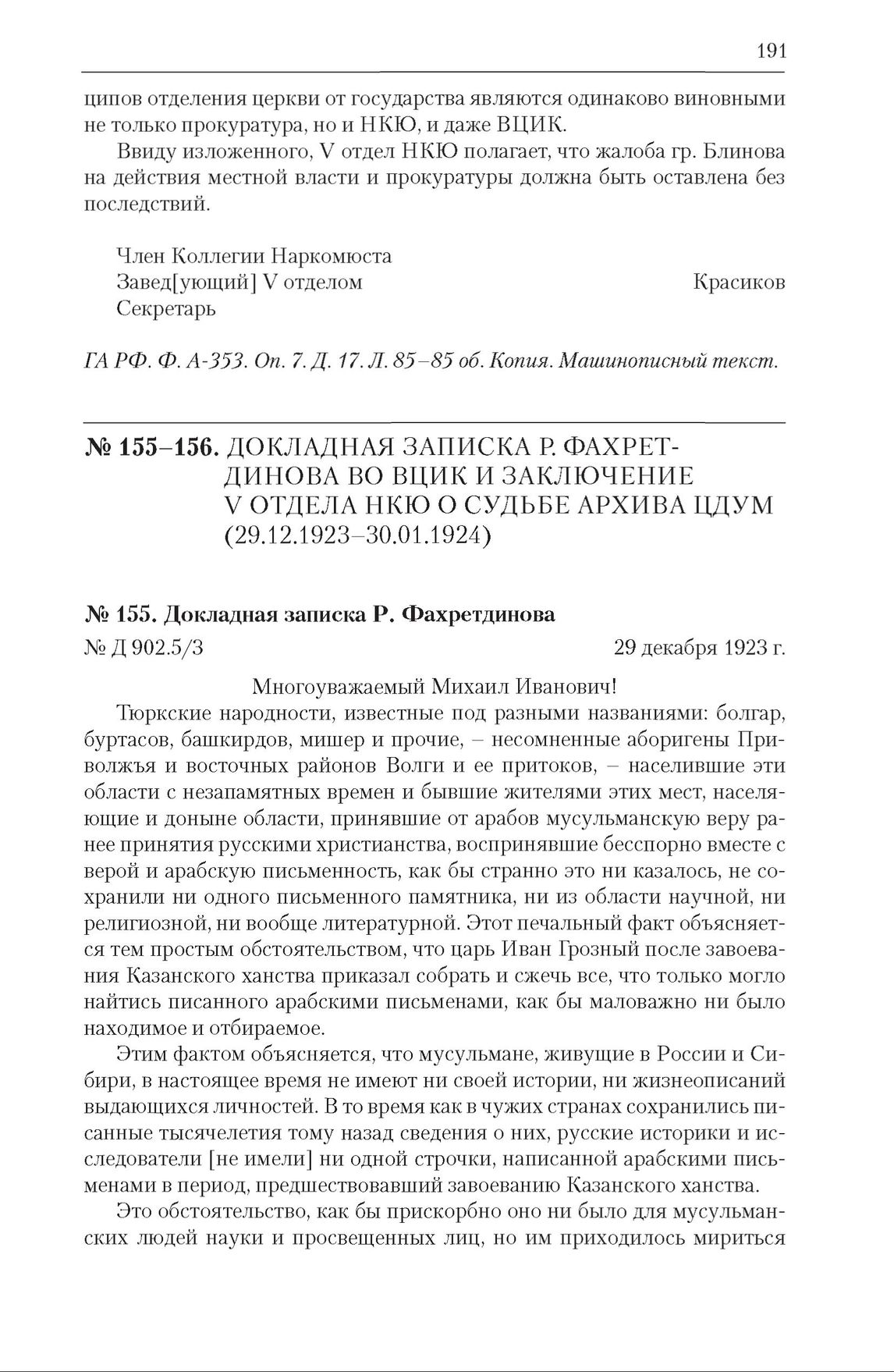 Докладная записка Р. Фахретдинова во ВЦИК и заключение V отдела НКЮ о судьбе Архива ЦДУМ (29.12.1923 – 30.01.1924). Докладная записка Р. Фахретдинова. 29 декабря 1923 г. // ГА РФ. Ф. Р-5263. Оп. 1. Д. 16. Л. 95–96 об. Заверенная копия. Машинописный текст.; «Мусульмане… преисполнены надежды, что будут полностью обладать и пользоваться правами… дарованными РСФСР». Письма председателя ЦДУМ муфтия Р. Фахретдинова председателю ЦИК М.И. Калинину. 1920-е гг. / публ. Д.Ю. Арапова и И.Л. Алексеева // Отечественные архивы. 2006 № 5. С. 103–105.