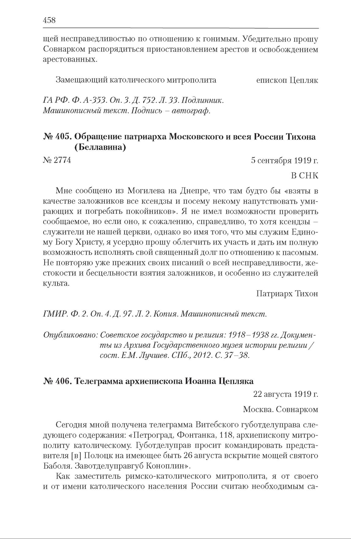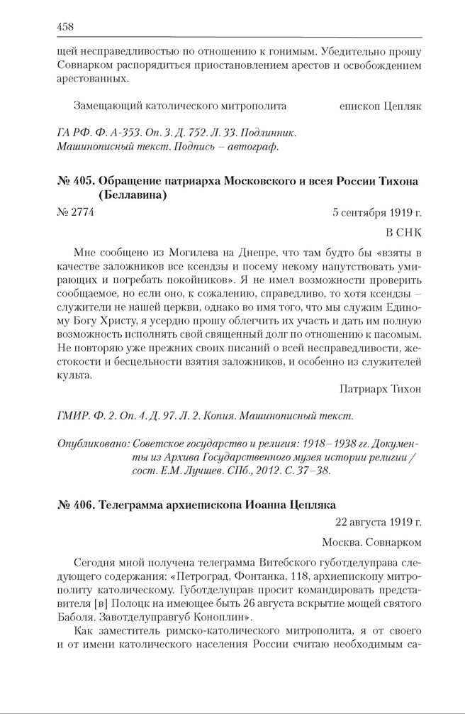 Обращения в СНК и переписка по вопросам положения Католической церкви, духовенства и верующих в России (11.08–05.09.1919). Телеграмма архиепископа Иоанна Цепляка. 22 августа 1919 г. // ГА РФ. Ф. А-353. Оп. 3. Д. 752. Л. 20–20 об. Копия. Машинописный текст.