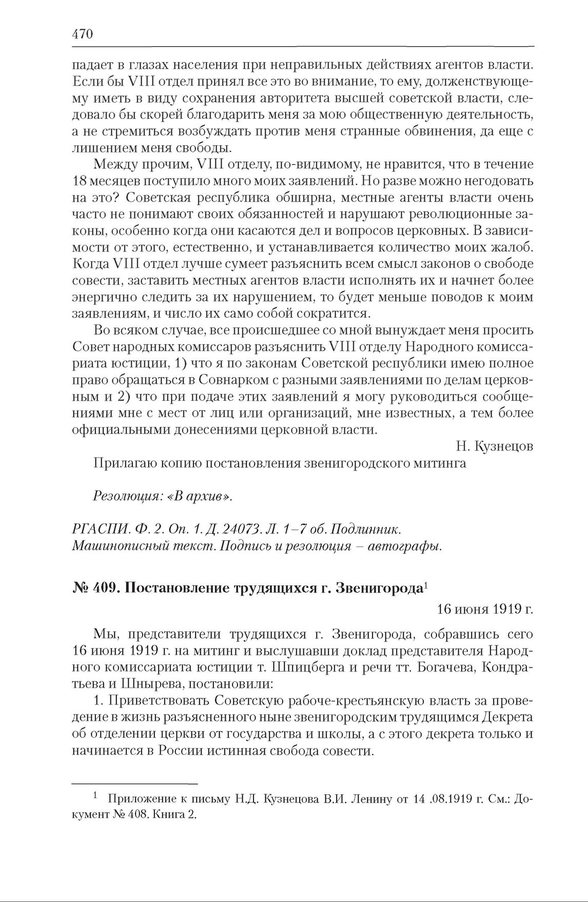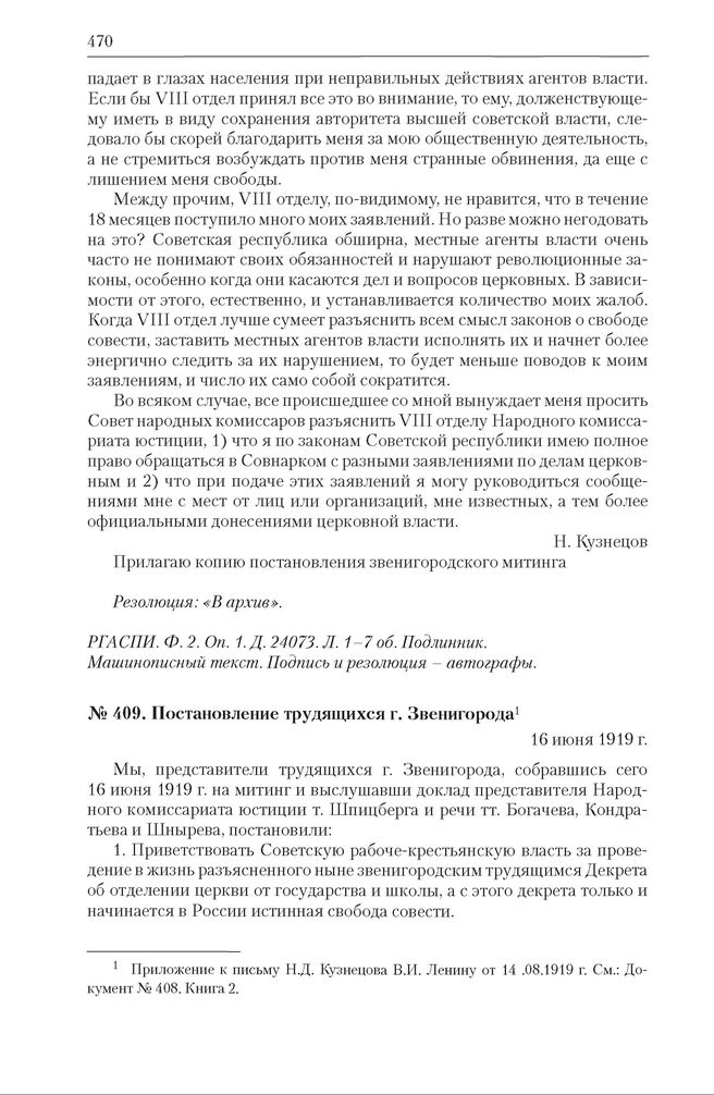 Обращения Н.Д. Кузнецова к В.И. Ленину с жалобой на действия VIII отдела НКЮ (16.06–16.08.1919). Постановление трудящихся г. Звенигорода. 16 июня 1919 г. // РГАСПИ. Ф. 2. Оп. 1. Д. 24073. Л. 8. Заверенная копия. Машинописный текст. Подпись Н. Кузнецова – автограф.