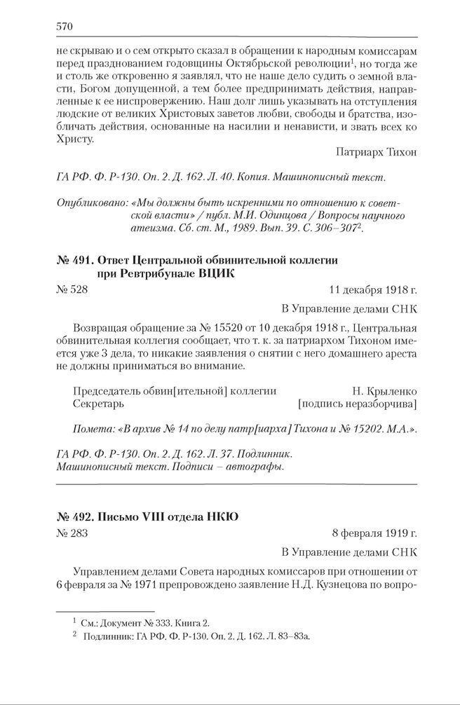 Заявление Н.Д. Кузнецова в СНК в связи с обвинением патриарха Московского и всея России Тихона (Беллавина) в публикации посланий с призывами против советской власти и переписка по этому вопросу (06–11.12.1918). Ответ Центральной обвинительной коллегии при Ревтрибунале ВЦИК. 11 декабря 1918 г. // ГА РФ. Ф. Р-130. Оп. 2. Д. 162. Л. 37. Подлинник. Машинописный текст. Подписи – автографы.