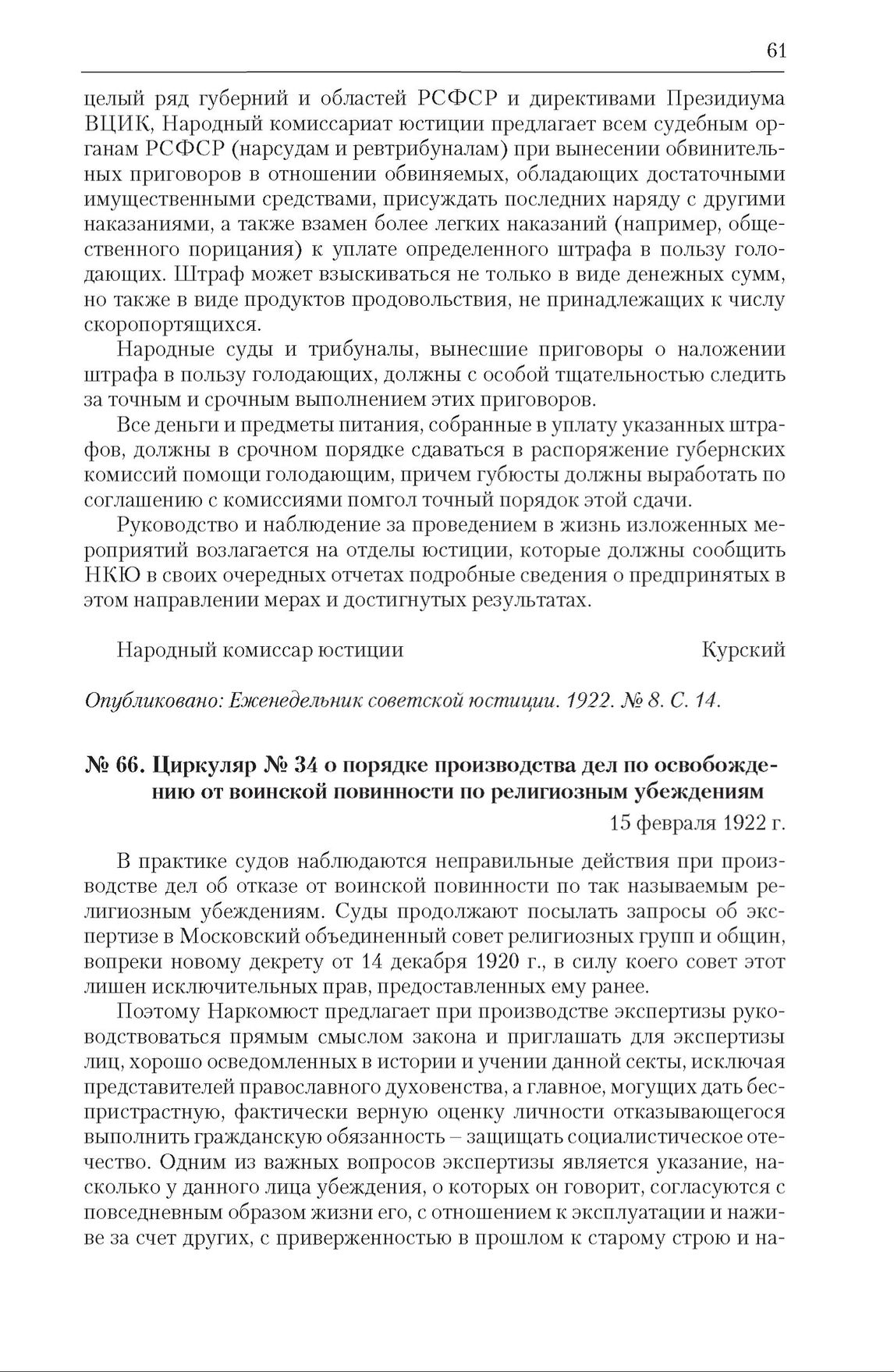 Циркуляр Наркомюста РСФСР № 34 о порядке производства дел по освобождению от воинской повинности по религиозным убеждениям. 15 февраля 1922 г. // Печатается по: Гидулянов П. В. Отделение церкви от государства в СССР: Полный сборник декретов, ведомственных распоряжений и определений Верховного Суда РСФСР и других социалистических республик. М., 1926. С. 391.