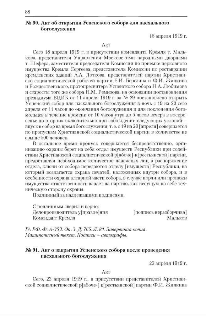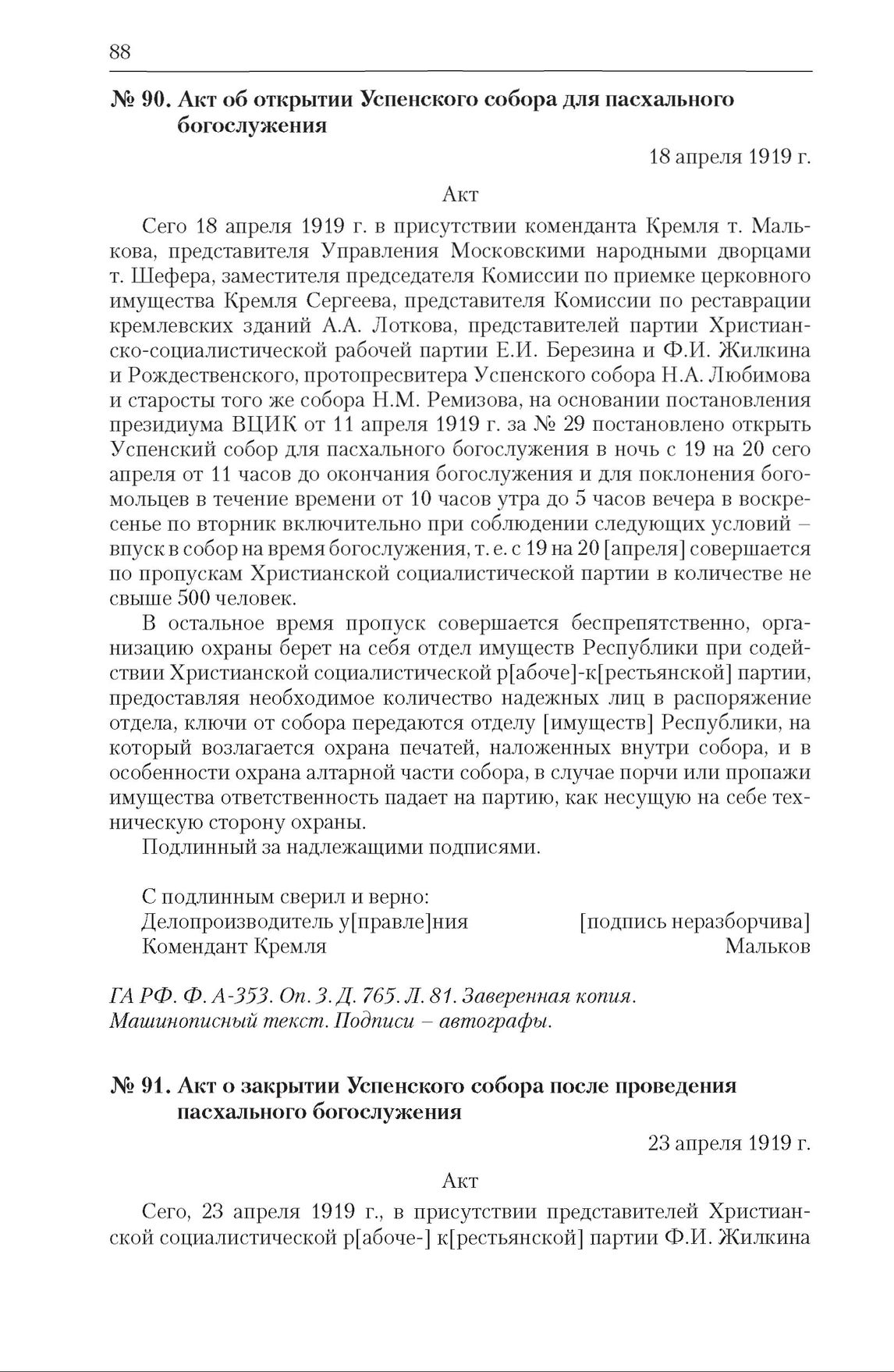 Акт о закрытии Успенского собора после проведения пасхального богослужения. 23 апреля 1919 г. // ГА РФ. Ф. А-353. Оп. 3. Д. 765. Л. 80. Копия. Машинописный текст.