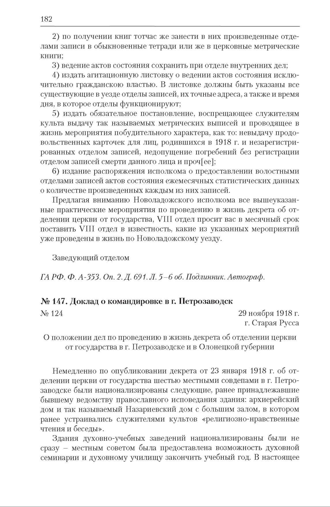 Конфессиональная политика советского государства. 1917—1991 гг. : Документы и материалы : в 6 т. Т. 1 : в 4 кн. : 1917-1924 гг. Кн. 3 : Народные комиссариаты СНК РСФСР (1917-1924) и СНК СССР (1922-1924): проведение в жизнь декрета «Об отделении церкви от государства и школы от церкви» — М. : Политическая энциклопедия, 2018.
