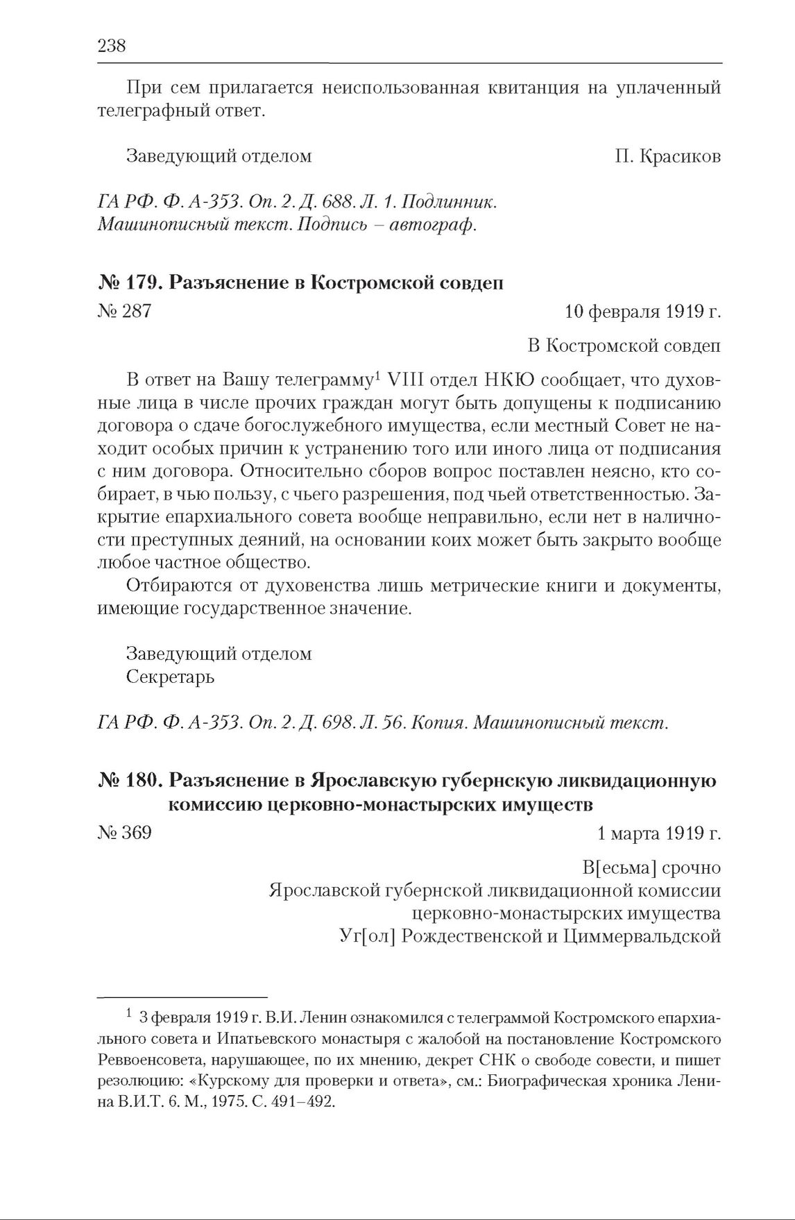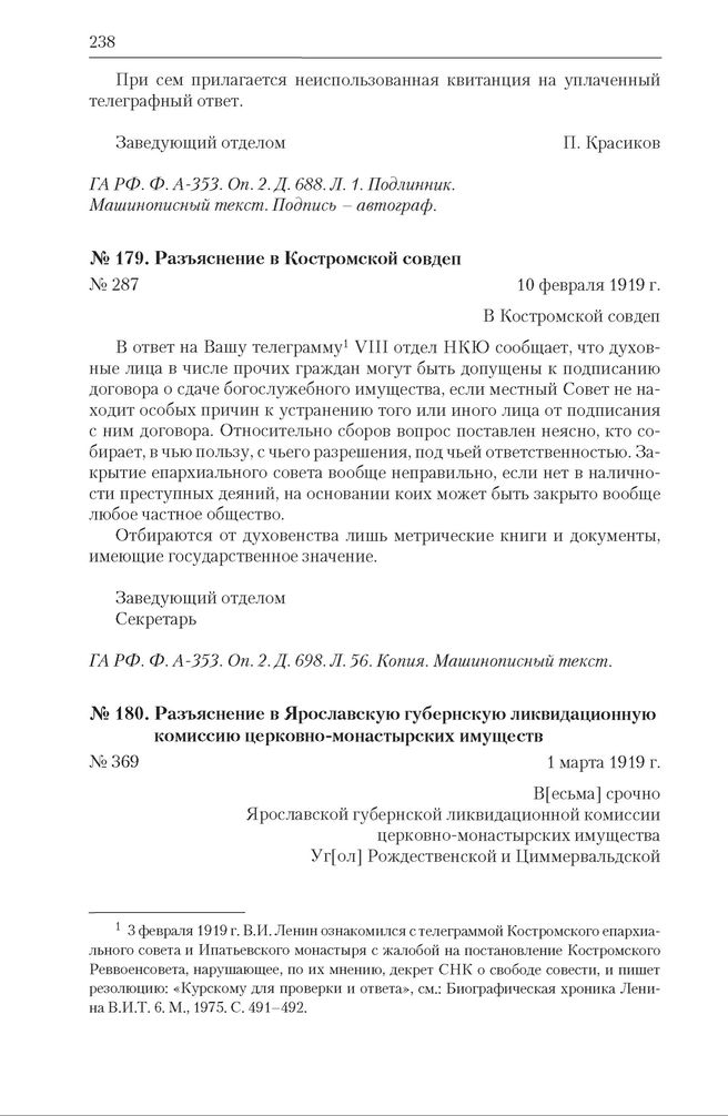 Конфессиональная политика советского государства. 1917—1991 гг. : Документы и материалы : в 6 т. Т. 1 : в 4 кн. : 1917-1924 гг. Кн. 3 : Народные комиссариаты СНК РСФСР (1917-1924) и СНК СССР (1922-1924): проведение в жизнь декрета «Об отделении церкви от государства и школы от церкви» — М. : Политическая энциклопедия, 2018.