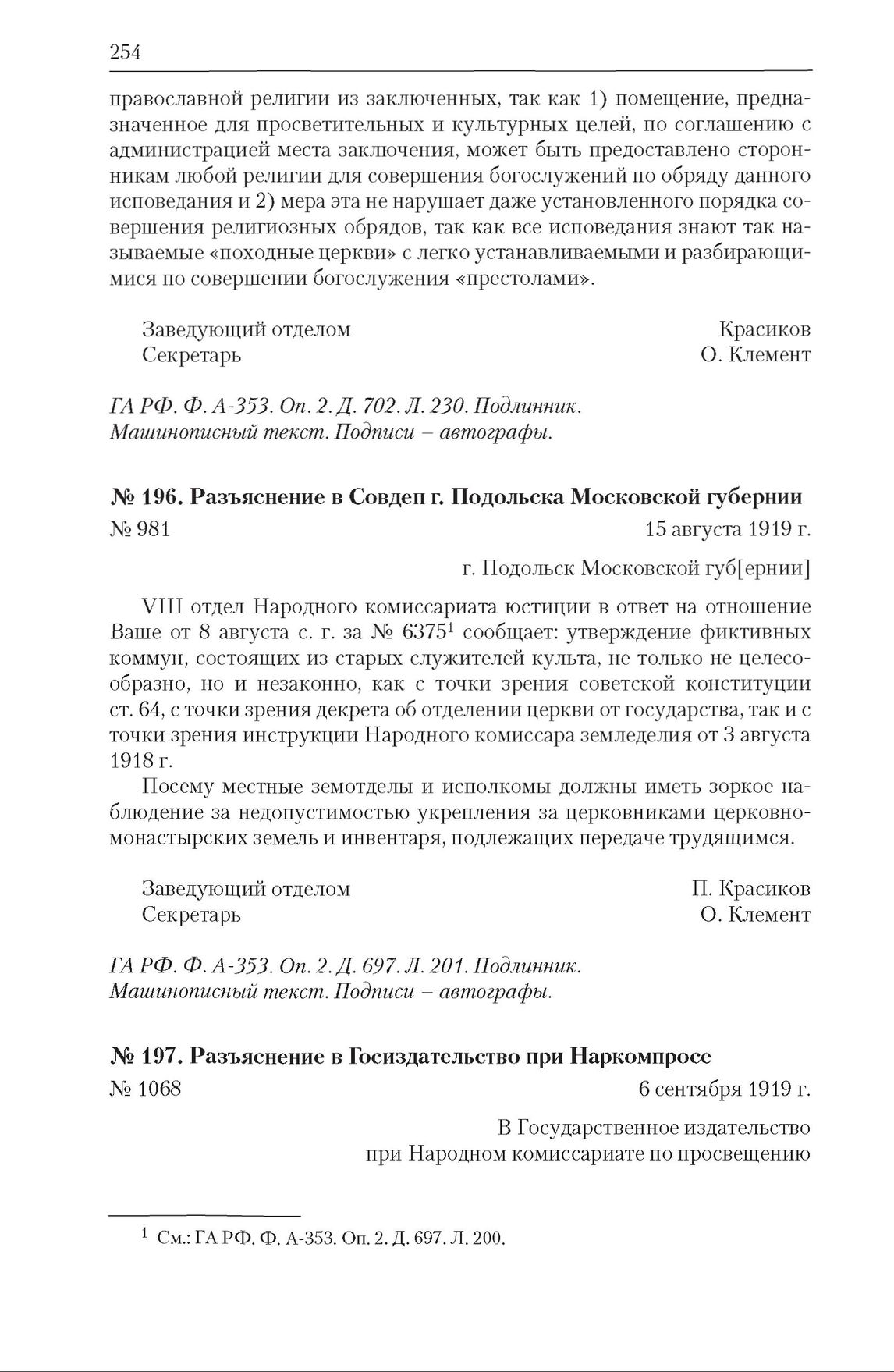 Конфессиональная политика советского государства. 1917—1991 гг. : Документы и материалы : в 6 т. Т. 1 : в 4 кн. : 1917-1924 гг. Кн. 3 : Народные комиссариаты СНК РСФСР (1917-1924) и СНК СССР (1922-1924): проведение в жизнь декрета «Об отделении церкви от государства и школы от церкви» — М. : Политическая энциклопедия, 2018.