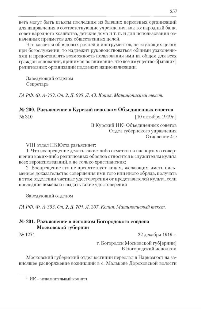 Конфессиональная политика советского государства. 1917—1991 гг. : Документы и материалы : в 6 т. Т. 1 : в 4 кн. : 1917-1924 гг. Кн. 3 : Народные комиссариаты СНК РСФСР (1917-1924) и СНК СССР (1922-1924): проведение в жизнь декрета «Об отделении церкви от государства и школы от церкви» — М. : Политическая энциклопедия, 2018.