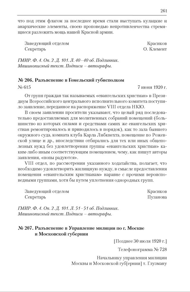 Конфессиональная политика советского государства. 1917—1991 гг. : Документы и материалы : в 6 т. Т. 1 : в 4 кн. : 1917-1924 гг. Кн. 3 : Народные комиссариаты СНК РСФСР (1917-1924) и СНК СССР (1922-1924): проведение в жизнь декрета «Об отделении церкви от государства и школы от церкви» — М. : Политическая энциклопедия, 2018.