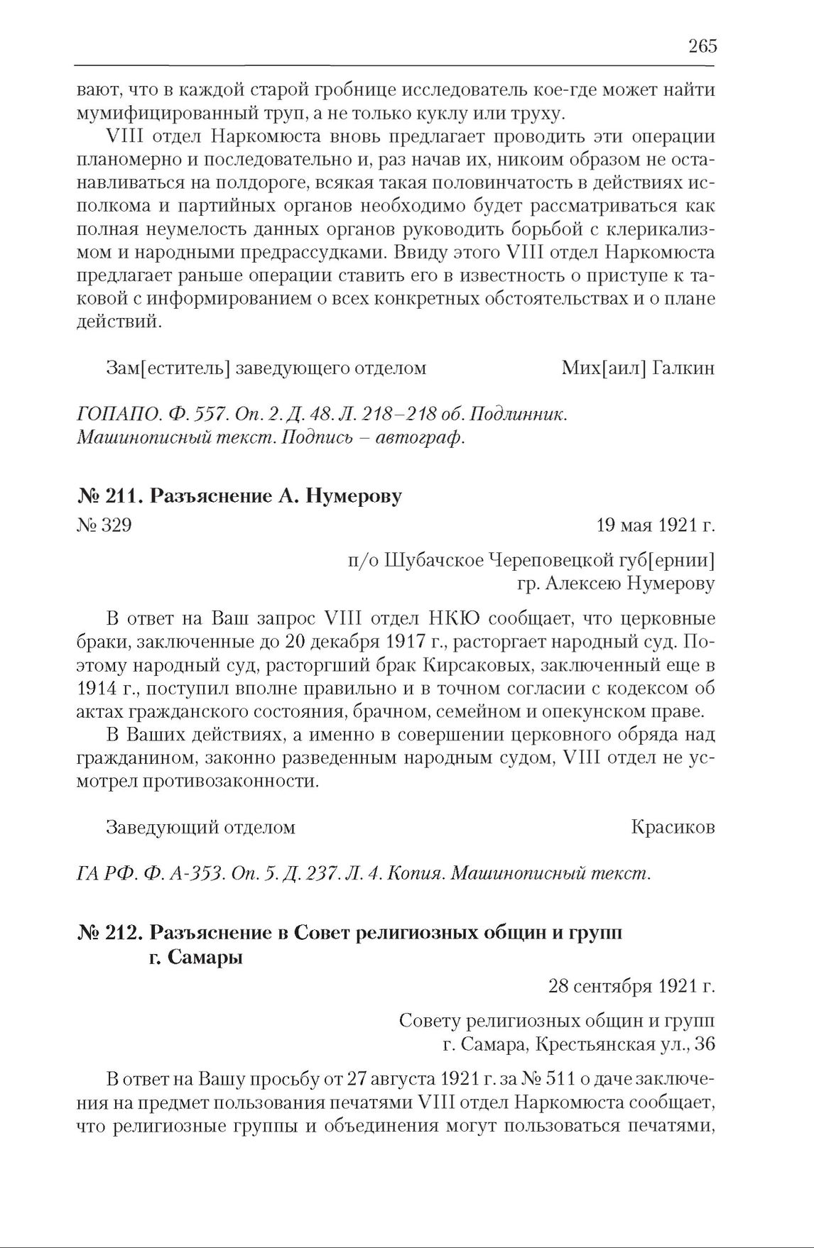 Разъяснение VIII (V) отдела НКЮ РСФСР в Совет религиозных общин и групп г. Самары. 28 сентября 1921 г. // ГА РФ. Ф. А-353. Оп. 5. Д. 257. Л. 163. Подлинник. Машинописный текст. Подписи – автографы.