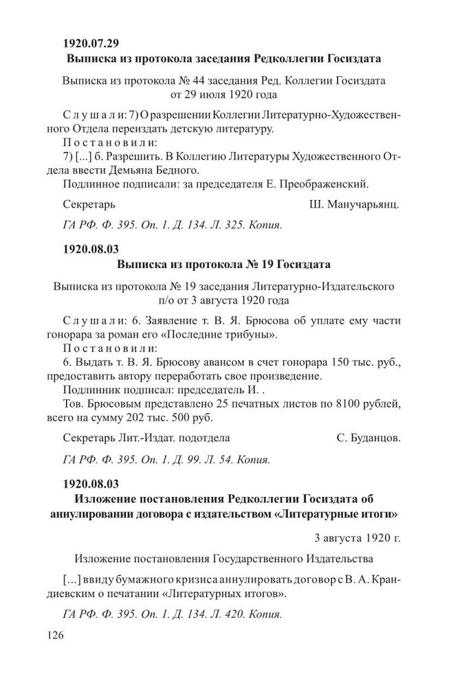 Изложение постановления Редколлегии Госиздата об аннулировании договора с издательством «Литературные итоги». 3 августа 1920 г. // ГА РФ. Ф. 395. Оп. 1. Д. 134. Л. 420. Копия.