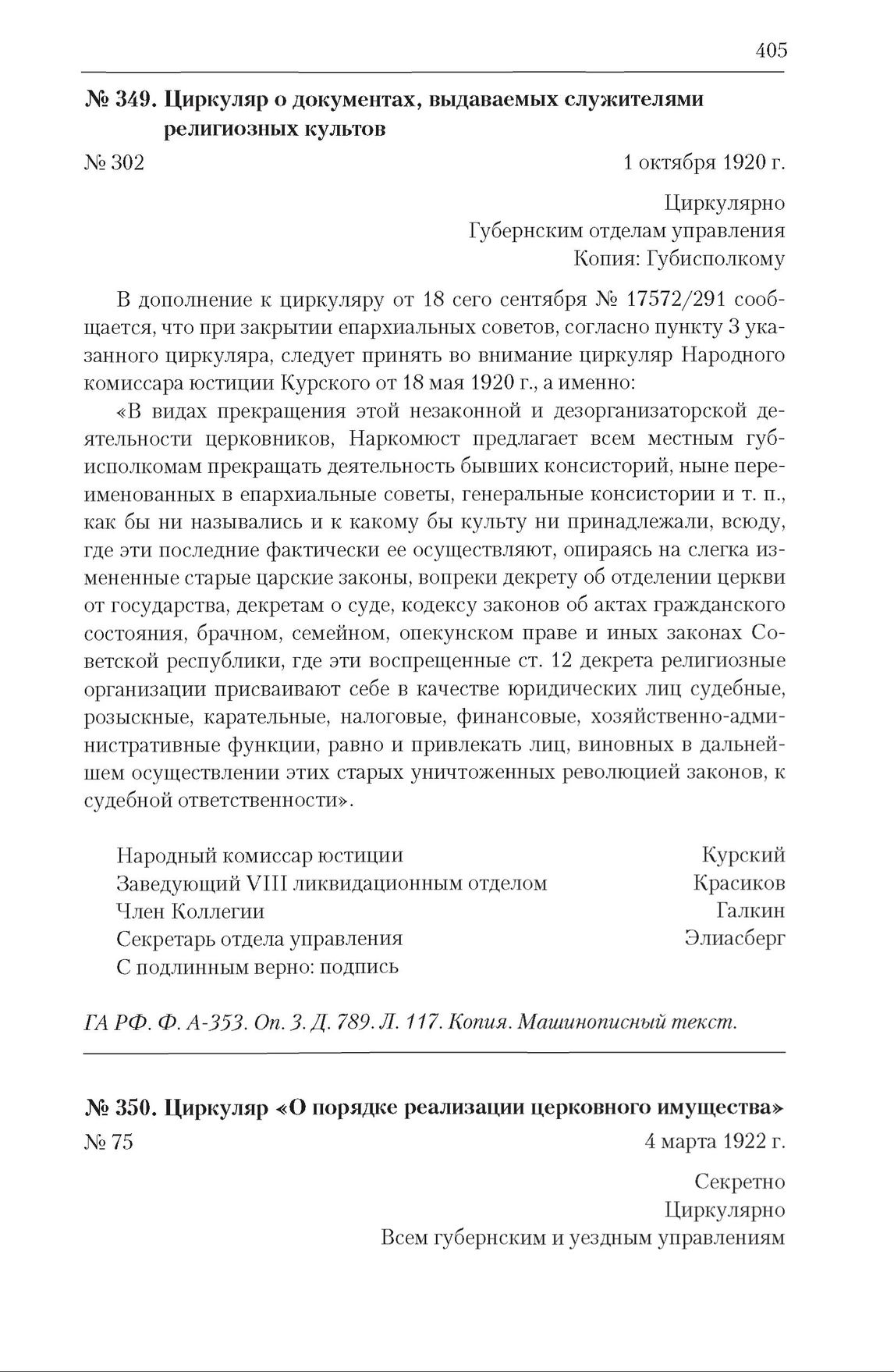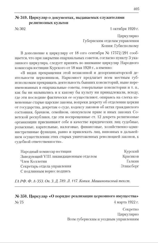 Конфессиональная политика советского государства. 1917—1991 гг. : Документы и материалы : в 6 т. Т. 1 : в 4 кн. : 1917-1924 гг. Кн. 3 : Народные комиссариаты СНК РСФСР (1917-1924) и СНК СССР (1922-1924): проведение в жизнь декрета «Об отделении церкви от государства и школы от церкви» — М. : Политическая энциклопедия, 2018.