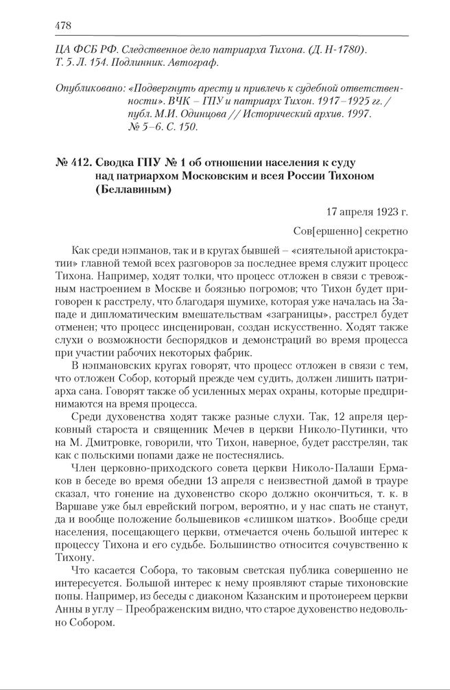 Сводка ГПУ № 1 об отношении населения к суду над патриархом Московским и всея России Тихоном (Беллавиным).17 апреля 1923 г. // ГА РФ. Ф. Р-5446. Оп. 55. Д. 409. Л. 104. Подлинник. Машинописная копия. Подпись и резолюция – автографы. Опубликовано: Одинцов М. И. Русские патриархи XX века: Судьбы Отечества и Церкви на страницах архивных документов. Ч. 1: «Дело» патриарха Тихона; Крестный путь патриарха Сергия. М., 1999. С. 98.