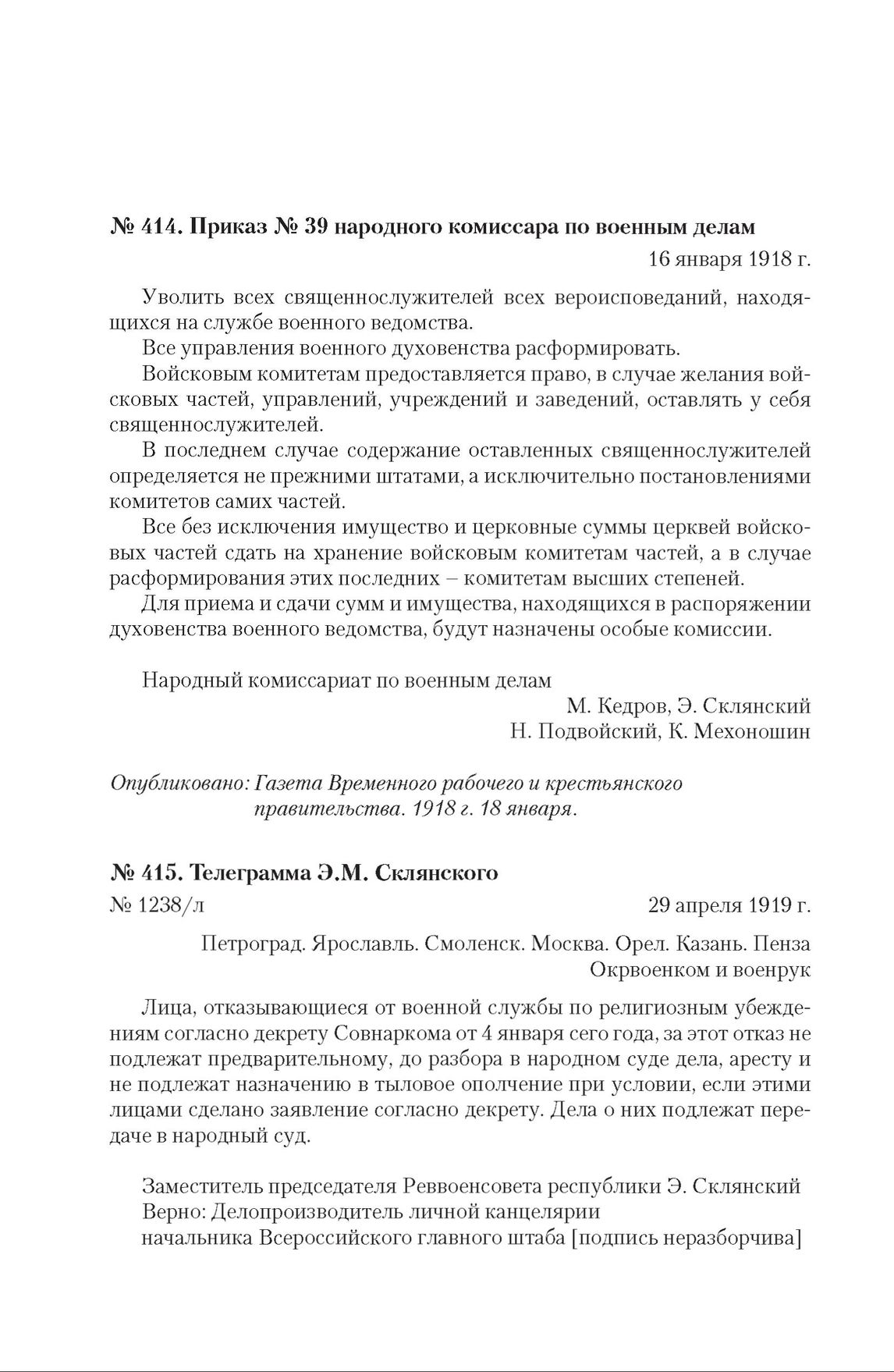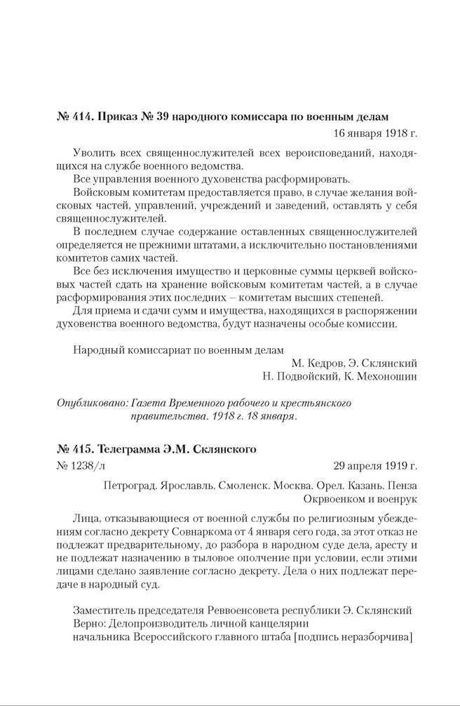Конфессиональная политика советского государства. 1917—1991 гг. : Документы и материалы : в 6 т. Т. 1 : в 4 кн. : 1917-1924 гг. Кн. 3 : Народные комиссариаты СНК РСФСР (1917-1924) и СНК СССР (1922-1924): проведение в жизнь декрета «Об отделении церкви от государства и школы от церкви» — М. : Политическая энциклопедия, 2018.