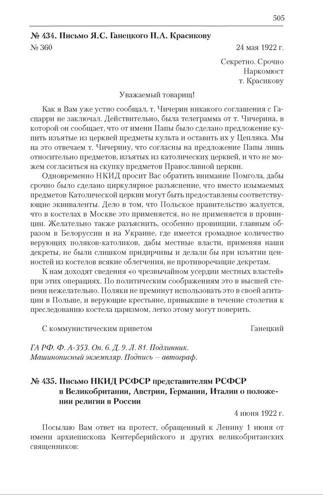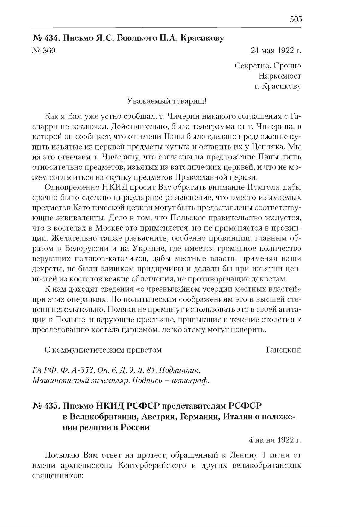 Письмо Я. С. Ганецкого П. А. Красикову. 24 мая 1922 г. // ГА РФ. Ф. А-353. Оп. 6. Д. 9. Л. 81. Подлинник. Машинописный экземпляр. Подпись – автограф.