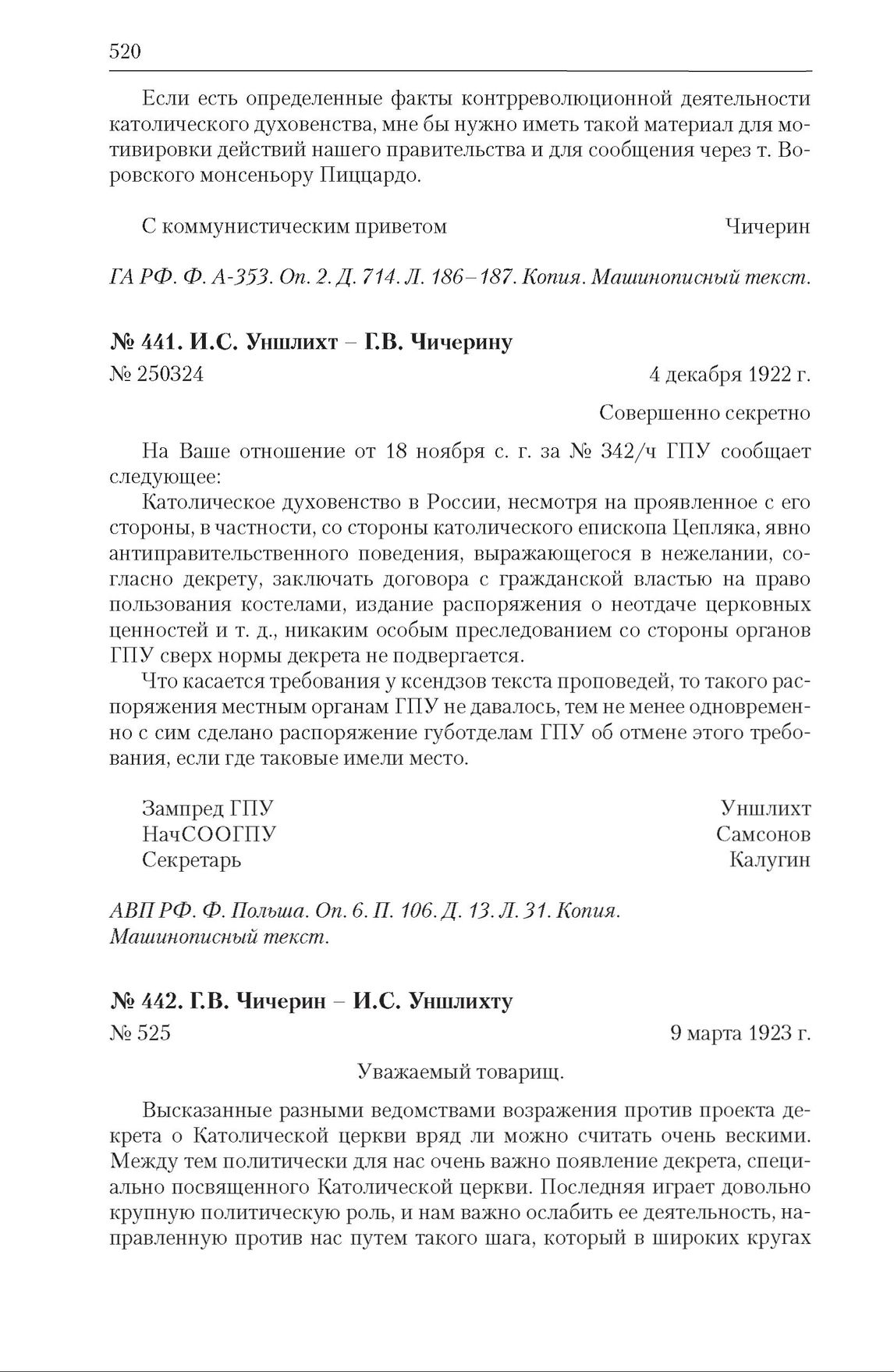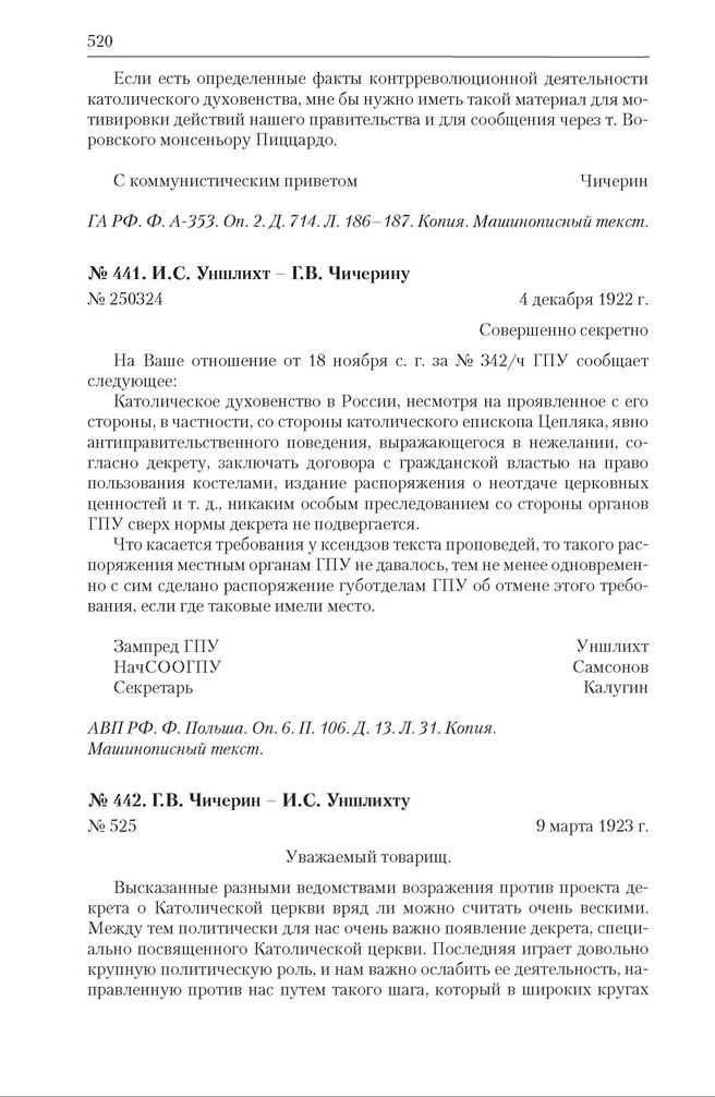 Письмо Г. В. Чичерин – И. С. Уншлихту о положении Католической церкви в России. 9 марта 1923 г. // АВП РФ. Ф. 098. Оп. 5. П. 102. Пор. 32. Л. 4–5. Подлинник. Машинописный текст. Подпись – автограф.